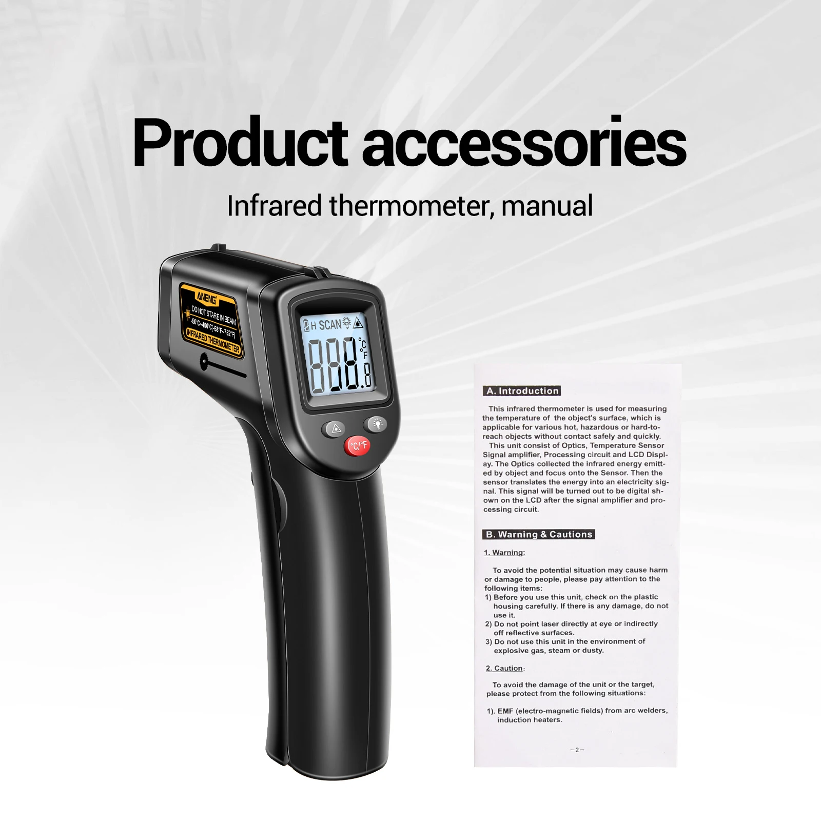 Digital infrared thermometer gun is a non-contact infrared temperature thermometer gun that quickly and safely takes surface temperature of objects that are out of reach, especially for those objects that would be dangerous to get close to or are moving. Capable of measuring a wide temperature range between -58℉ to 752℉ in daily uses and industrial area.