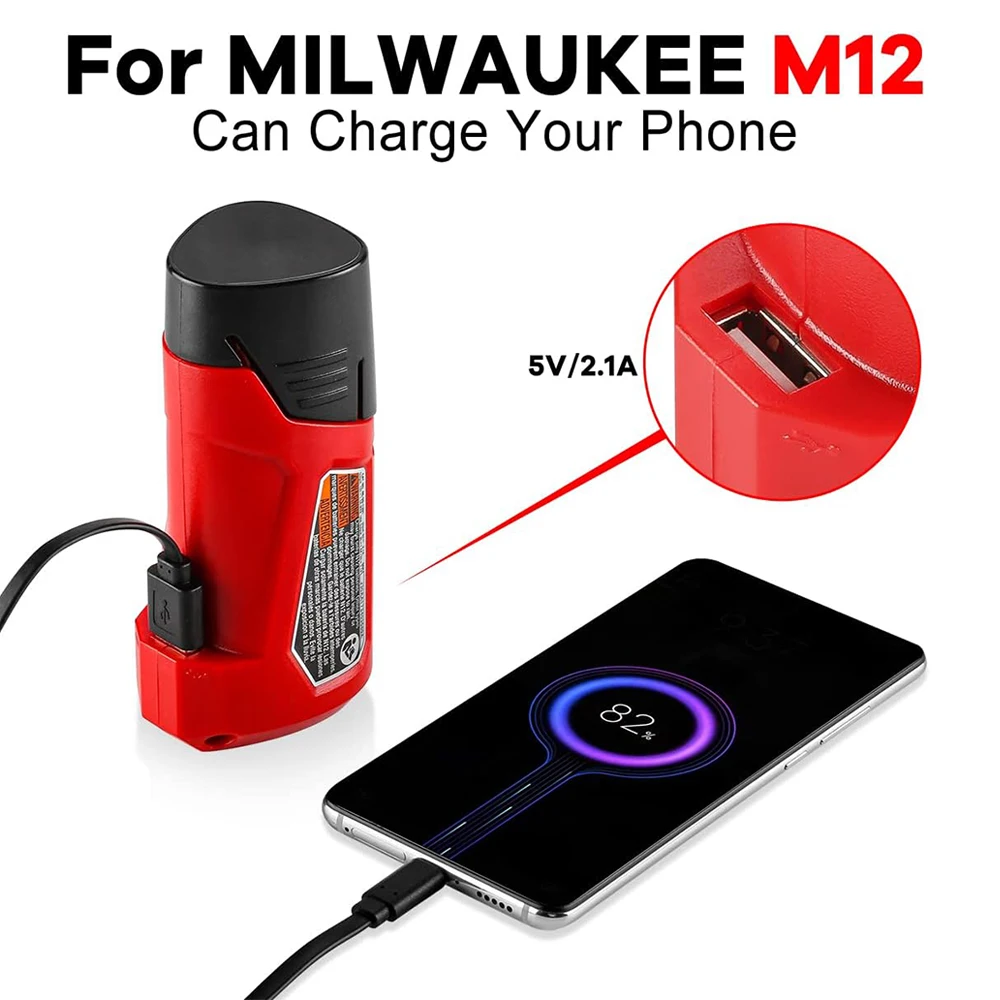 Compatible with in-vehicle USB ports, 2.1A wall plug charges M12 2.0 Ah battery in less than 3 hours. The LED charging indicator gives you feedback on battery charge Rate status.