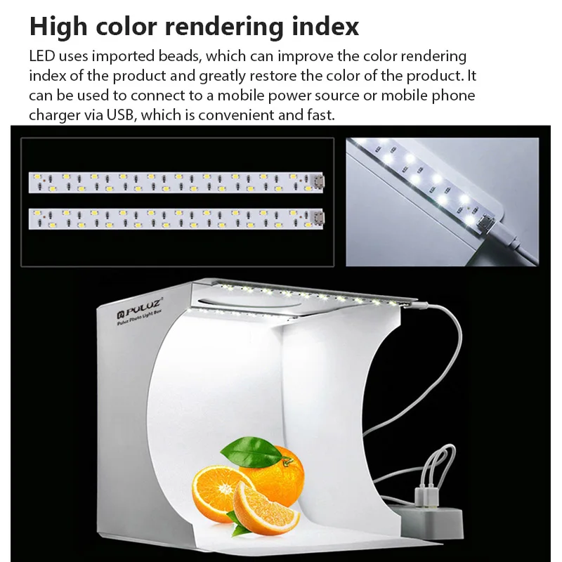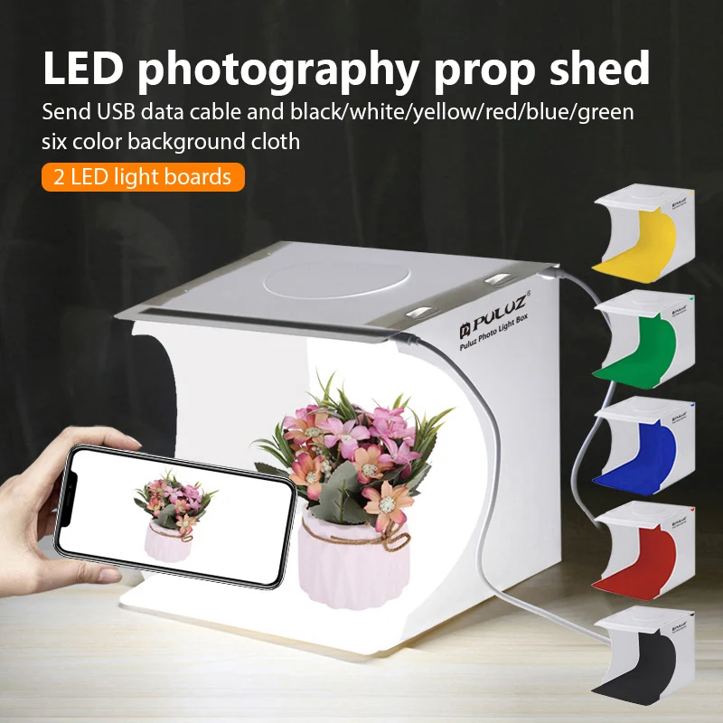 5. With 2 backgrounds, and build-in light and USB cable (You should prepare a usb charger to power it.).