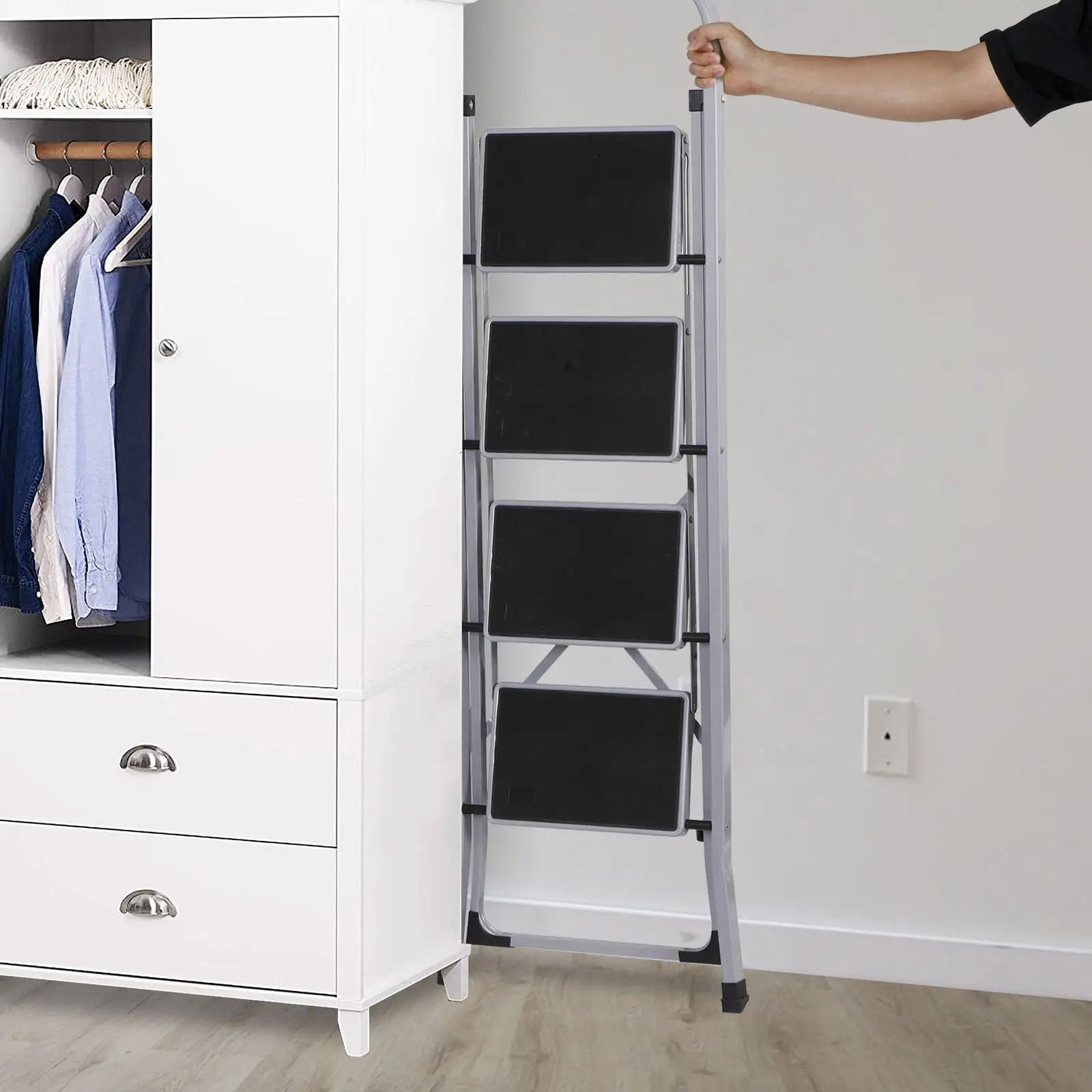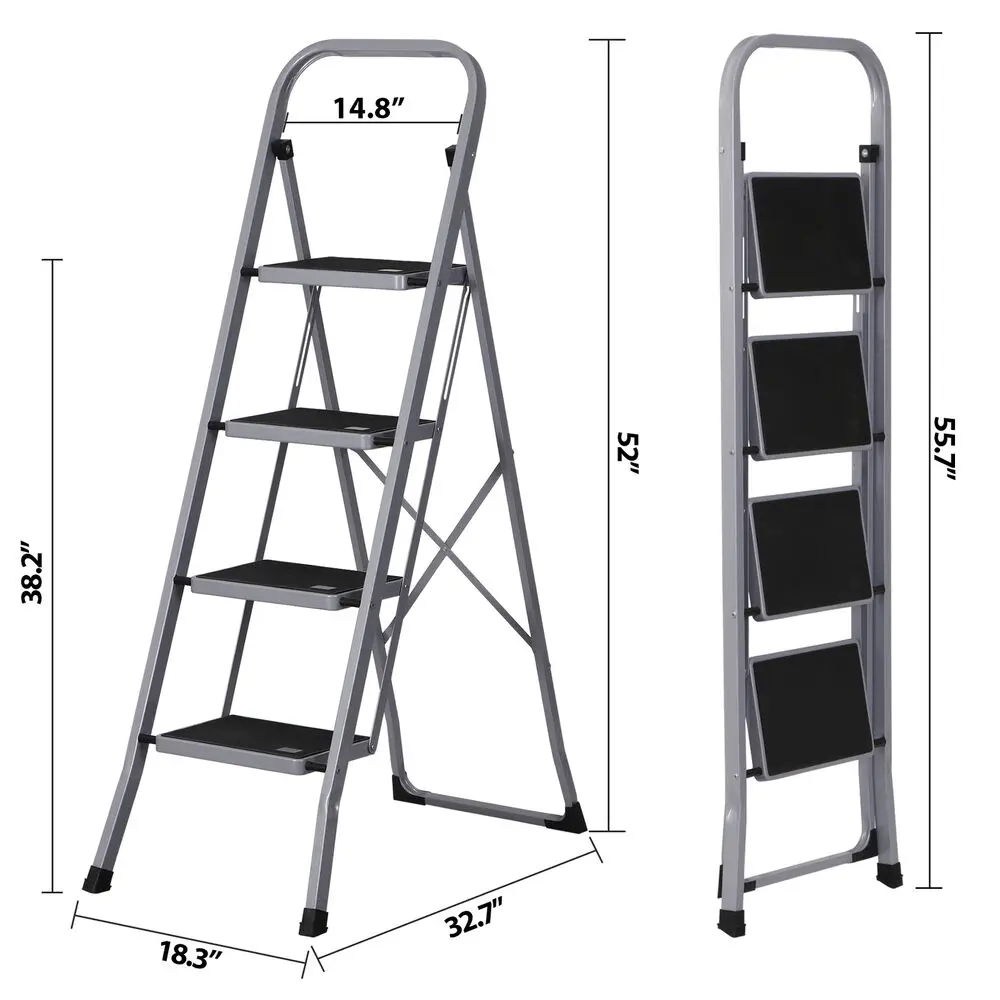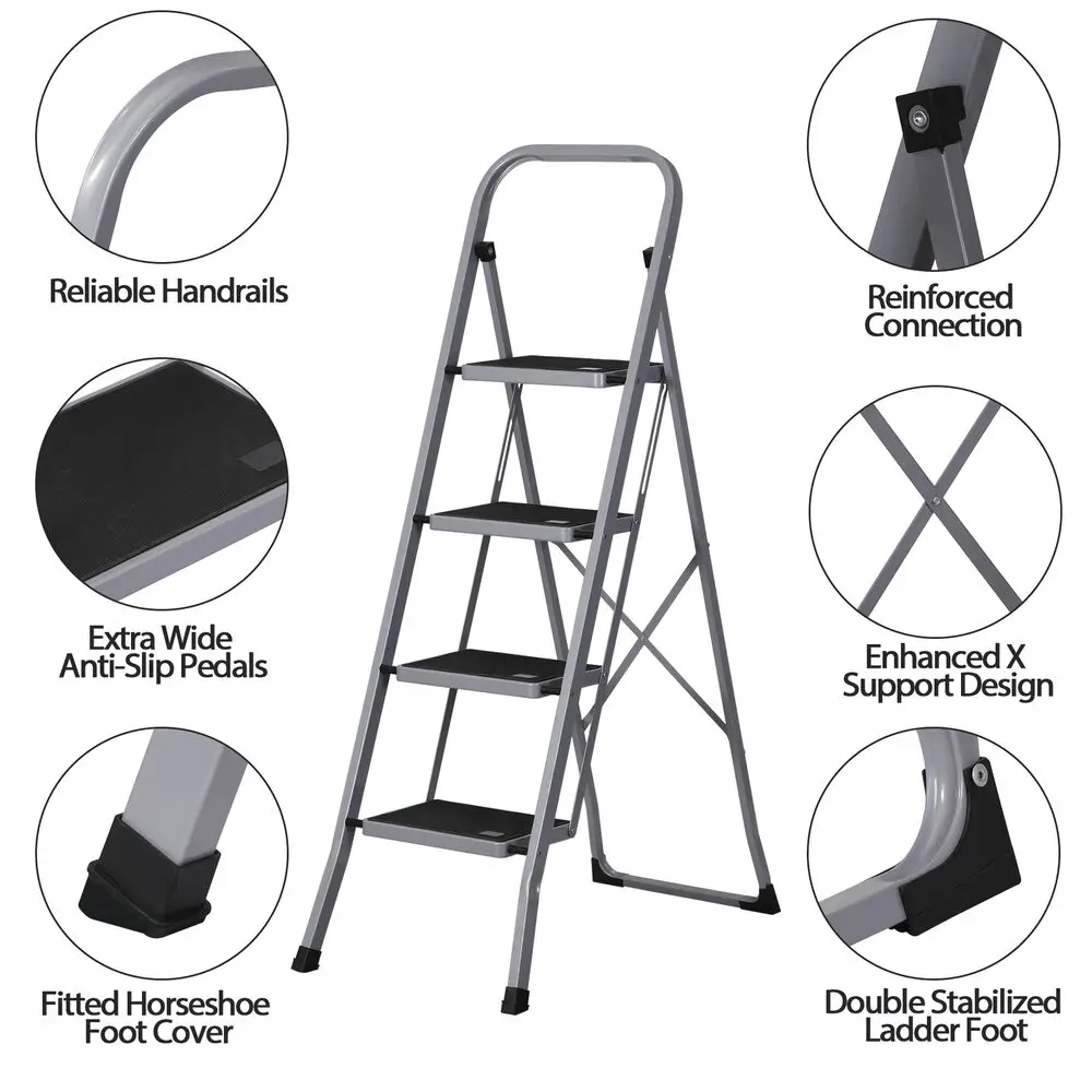 4 Step Ladder Foldable Stool Ladder Non-Slip Steel platform Steps Home Grey
