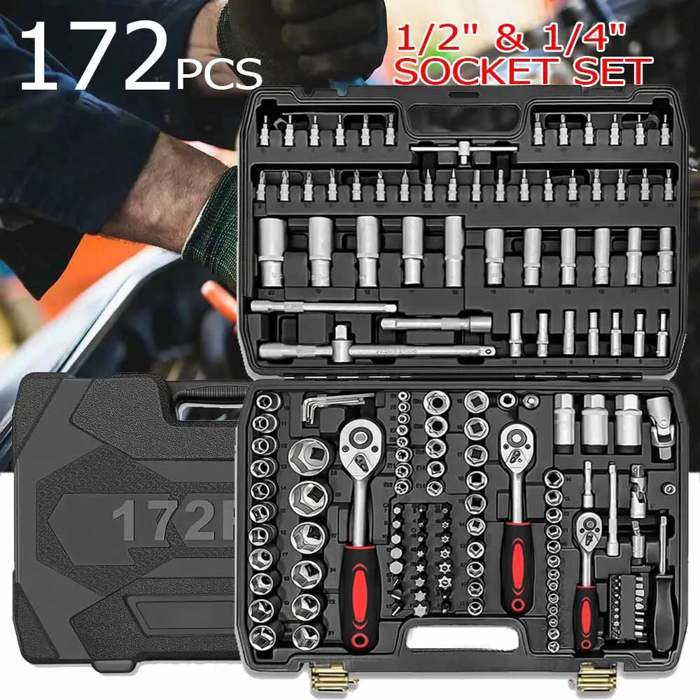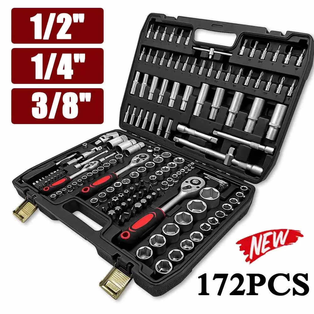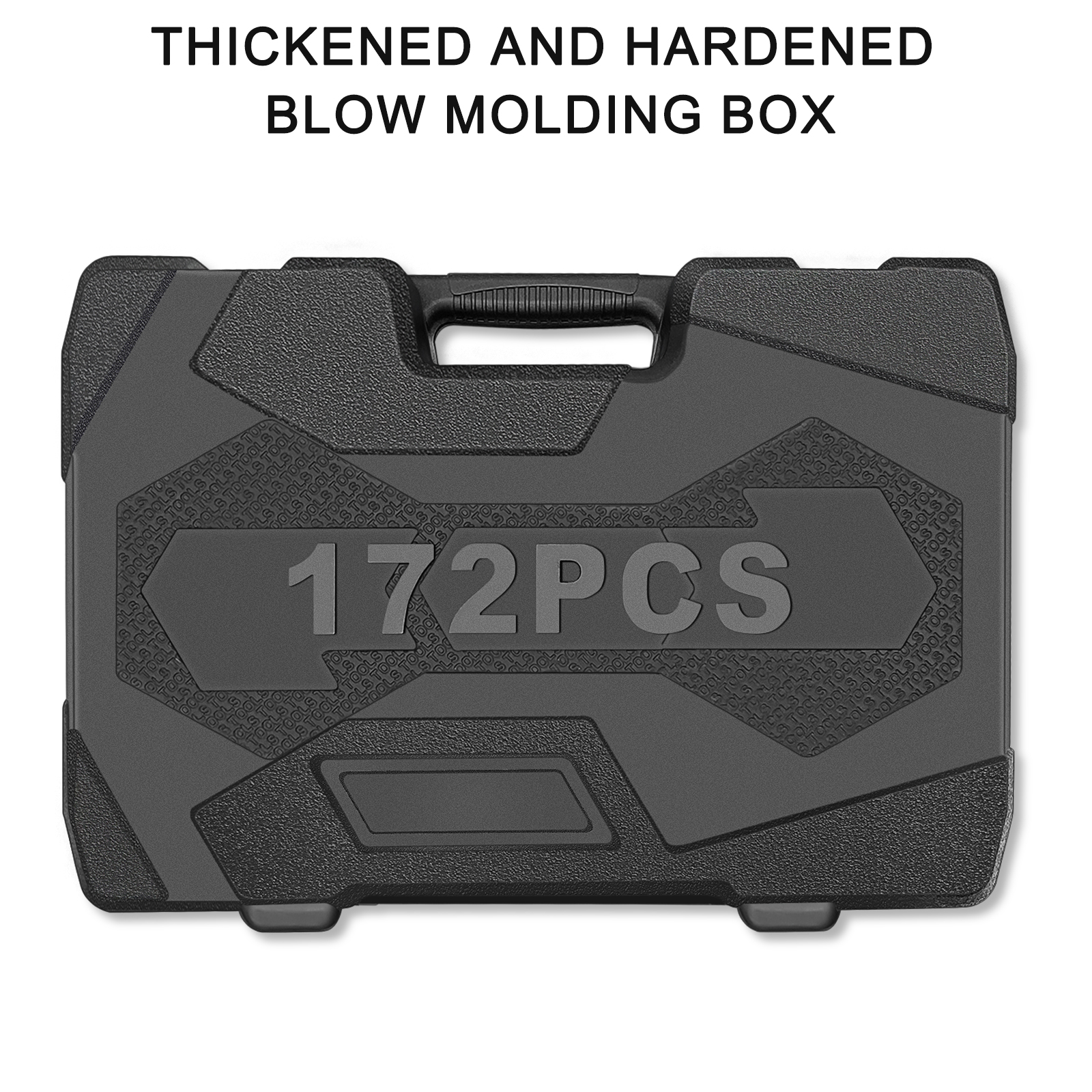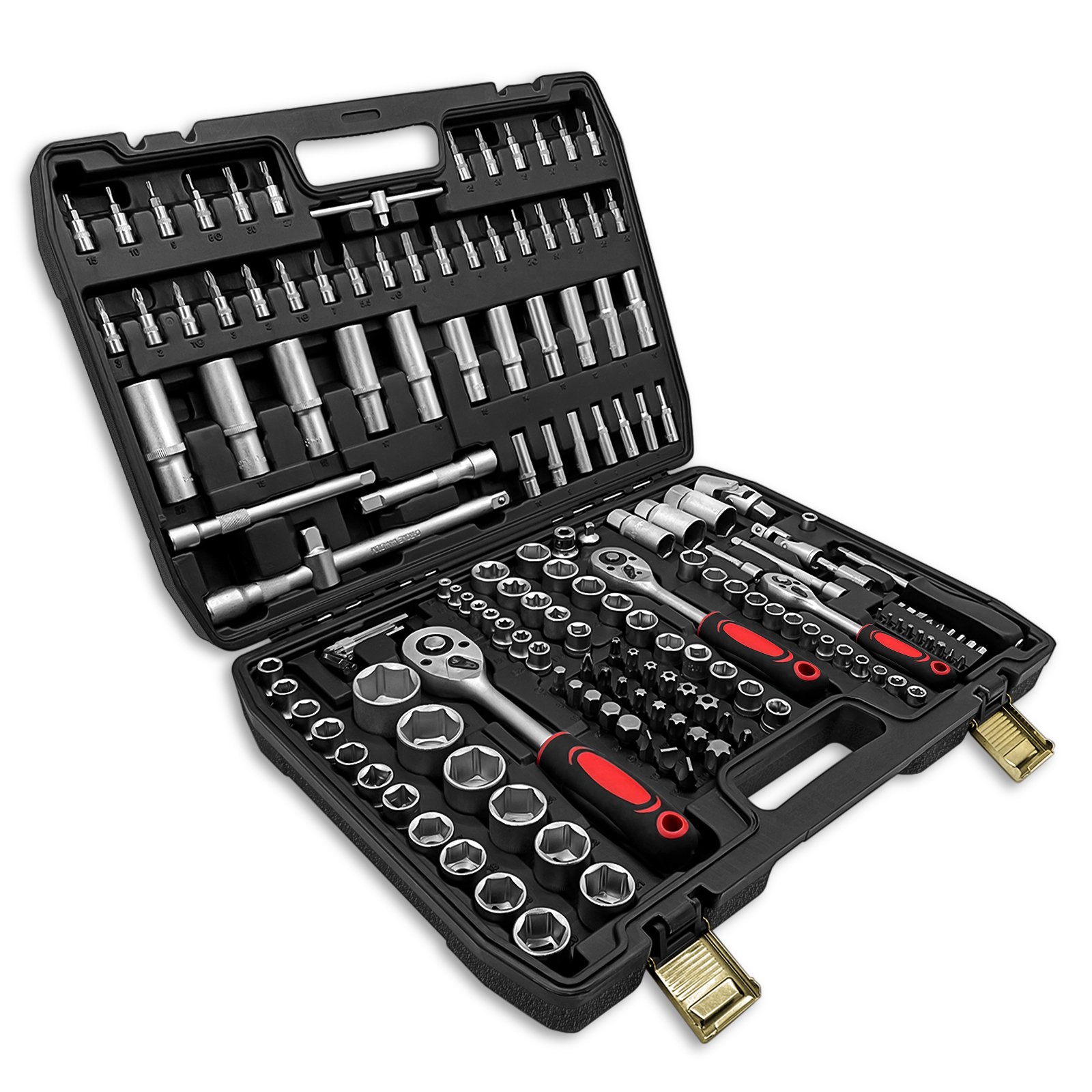 Professional socket set 1/2" 1/4" 3/8" 172 pieces. Sockets are made with high quality Chrome Vanadium steel Screwdriver bits and star socket bits are made with S2 steel for longer life and durability. S2 steel is harder done traditional 8650 steel and gives for bits exceptional life span. Sockets equipped with AS-DRIVE system which increases maximum torque by 25% with full protection to caps/nuts