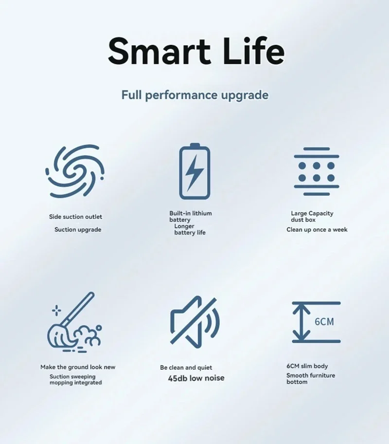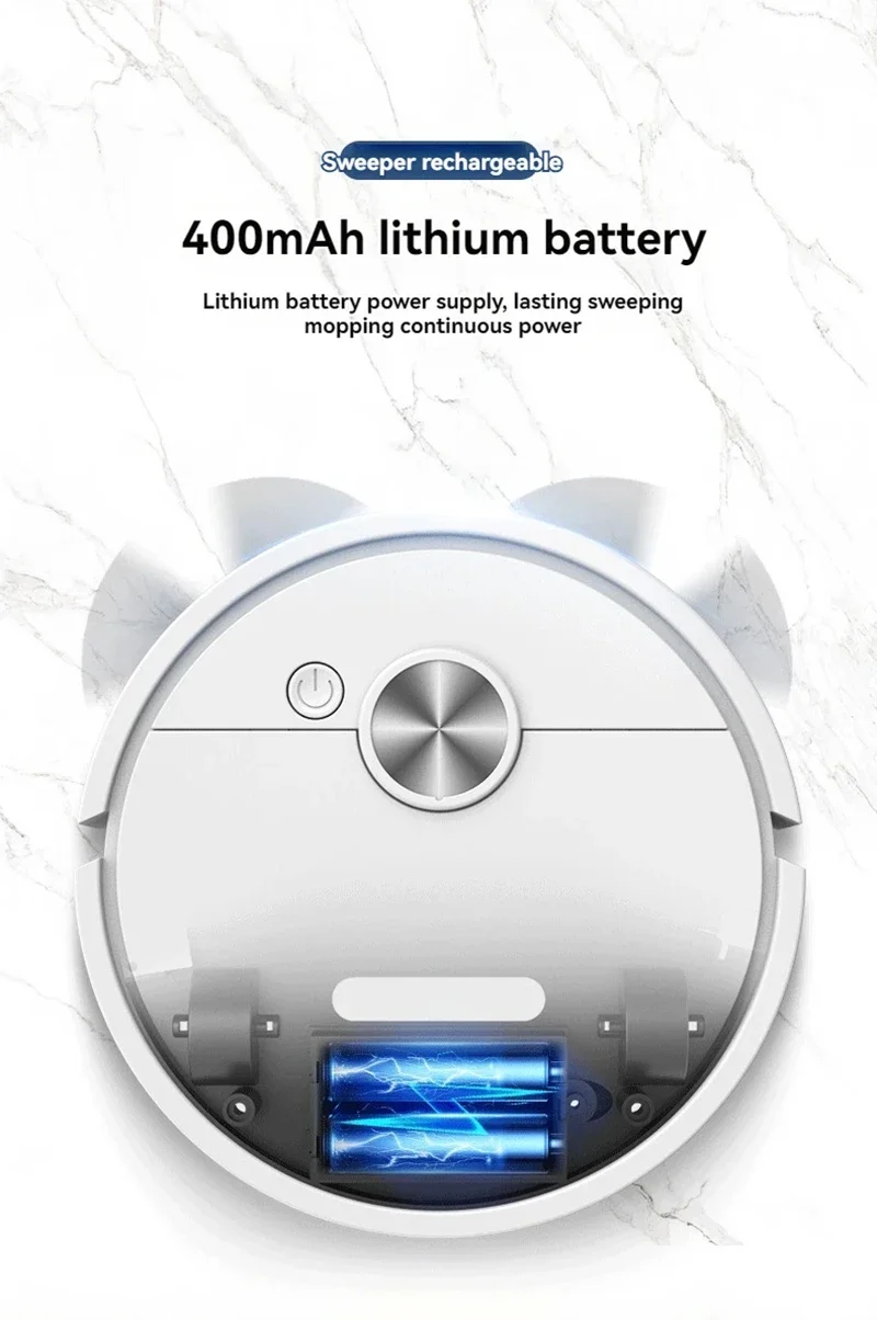 The Smart Sweeping Robot comes with a high-capacity battery that provides up to 2.5 hours of continuous cleaning, allowing it to clean large areas without needing to recharge.