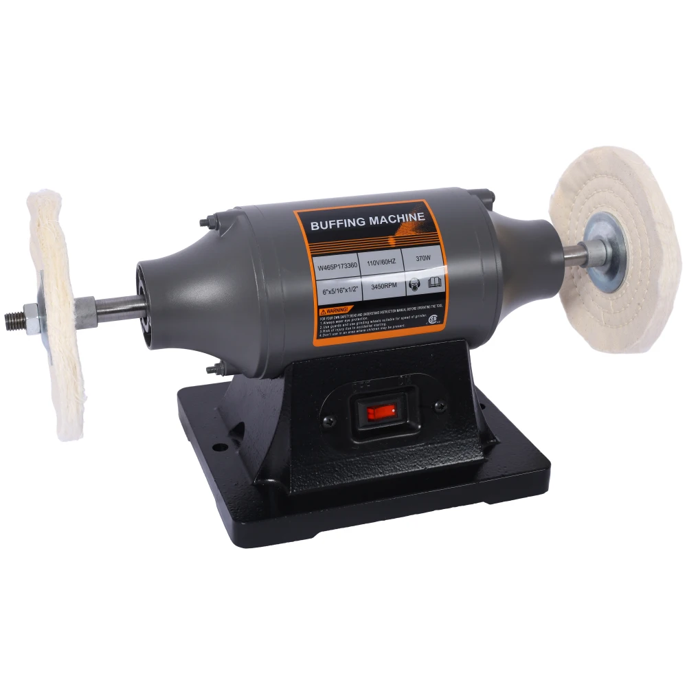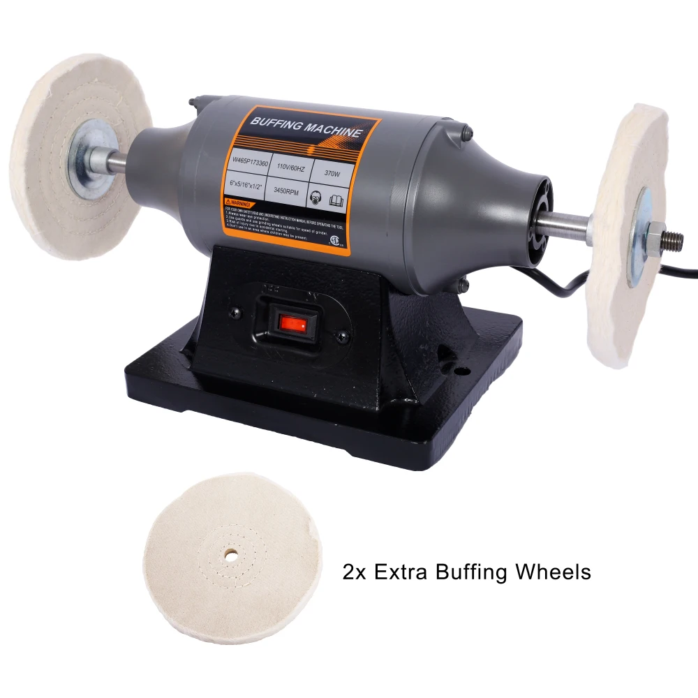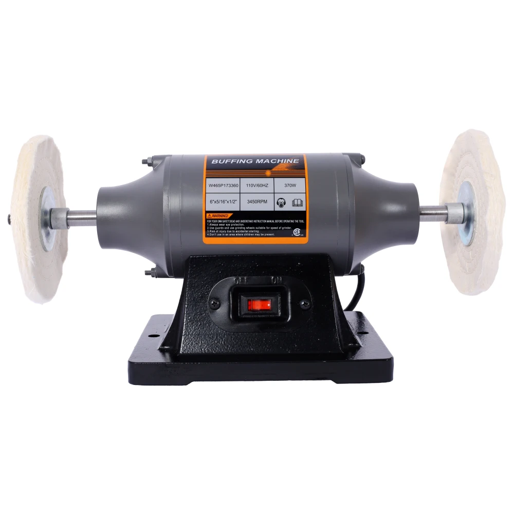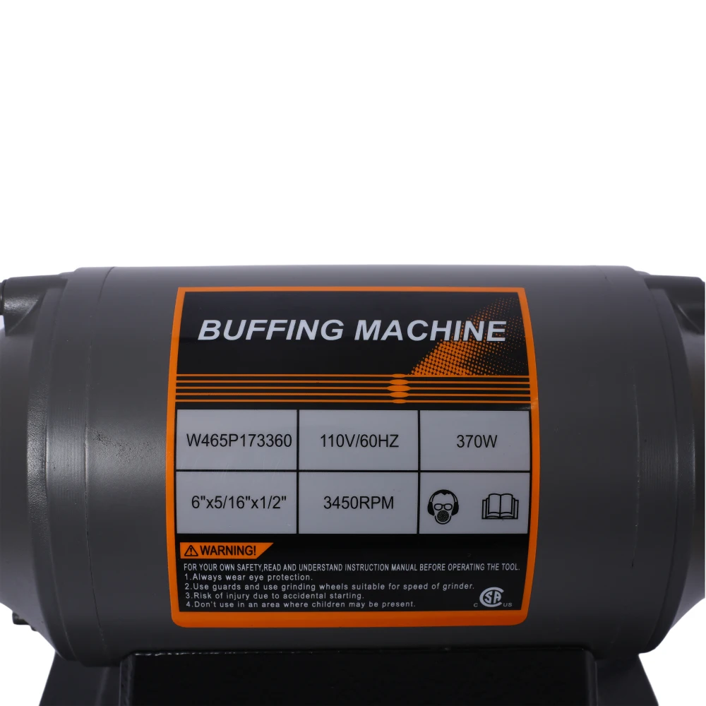 Power Buffer Specs:6" buffing wheel diameter for versatile polishing.370w ½ horsepower induction motor for reliable performance.110V, 60 Hz, 3450 RPM for fast, efficient polishing.