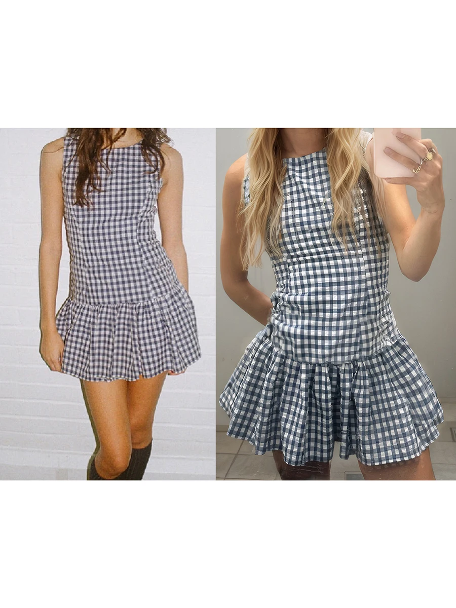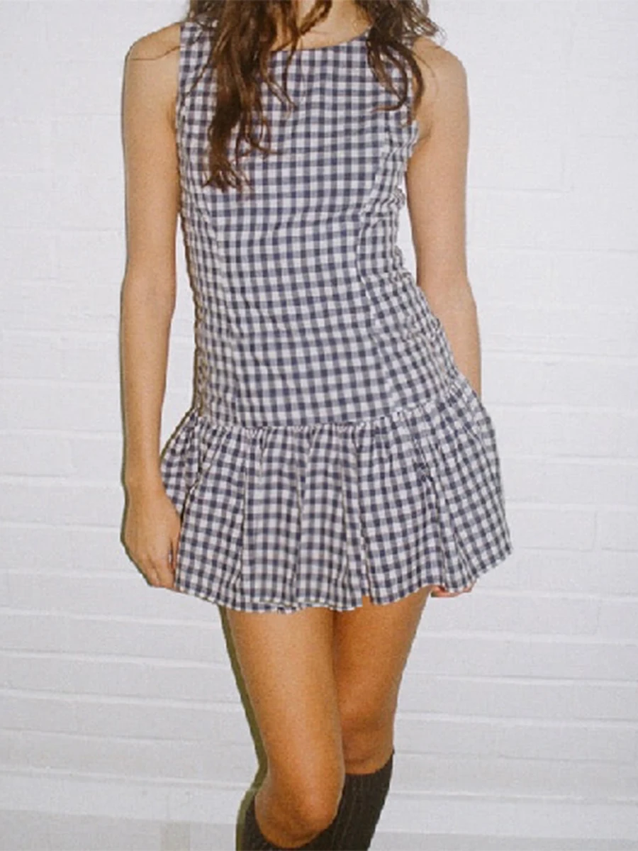 Women Mini Dress Plaid/Dot Print Round Neck Dress Summer Ruffles Hem Sleeveless Fashion Casual Dress