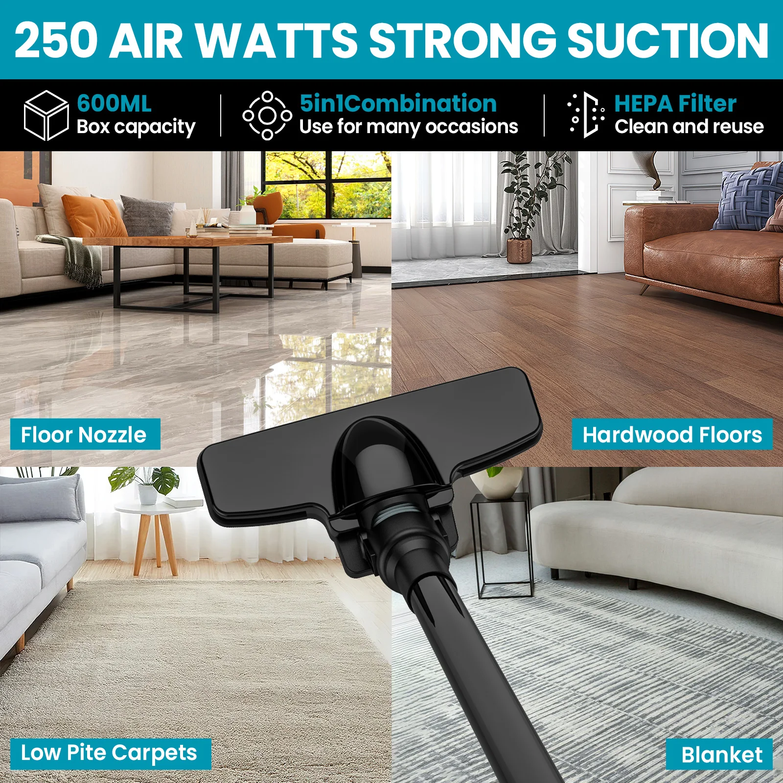 The vacuum customer come in a 5-in-1 design with oven different brushes to meet all your cleaning feet, wether carpet, hard floors, furniture or night corners. Keep the noise level below 36 decibels to avoid disurbing noise, making it the best choice for cleaning your studio and home