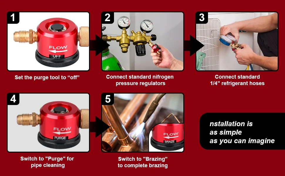 【Easy to Operate】Effortlessly switch between "Purge," "Braze," and "Close" modes by simply connecting a standard 1/4" refrigerant hose and nitrogen pressure regulator—finish the work in a short period of time.