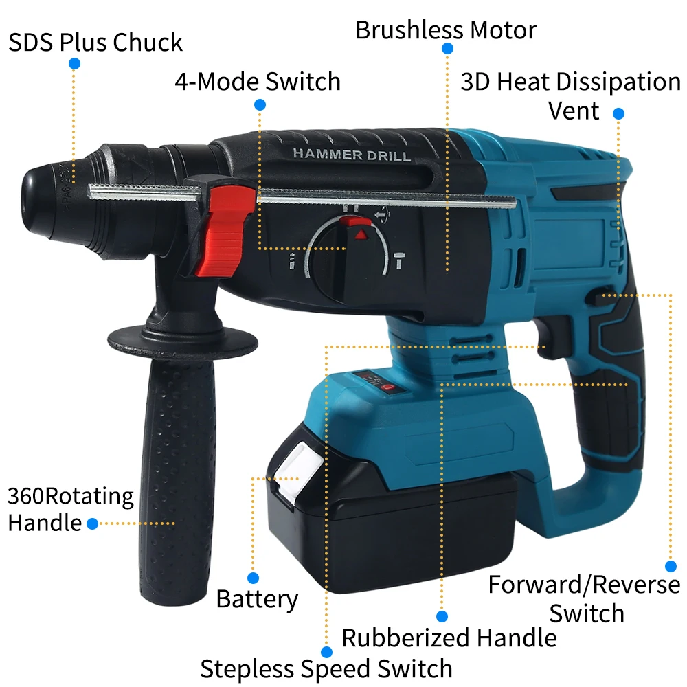 26MM Brushless Electric Hammer Drill Multifunctional Cordless Rotary Hammer Impact Drill Power Tool For Makita 18V Battery