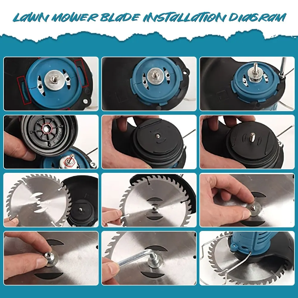 Flat blade x2, wheel x1 set, plastic blade x5, circular saw blade x1, small socket x1, T-shaped screwdriver x1, blade guard wire x1, grass guard x1, battery x1, charger x1, body x1, English instruction manual x1.
