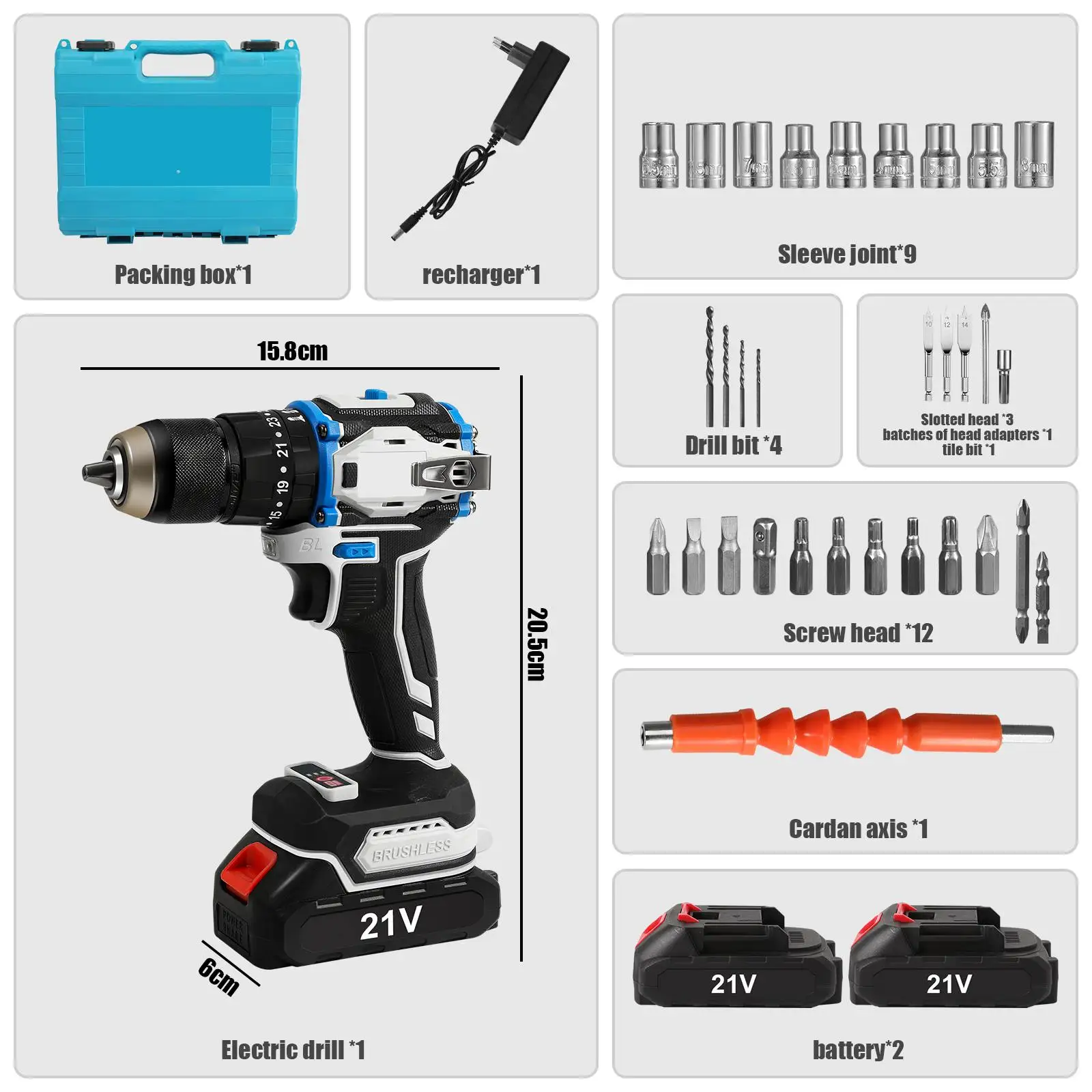 Total number of accessories: 31pcs(9 socket joints, 12 screw heads, 3 slotted heads, 4 drill bits, 1 tile bit, 1 universal shaft, 1 batch head adapter)