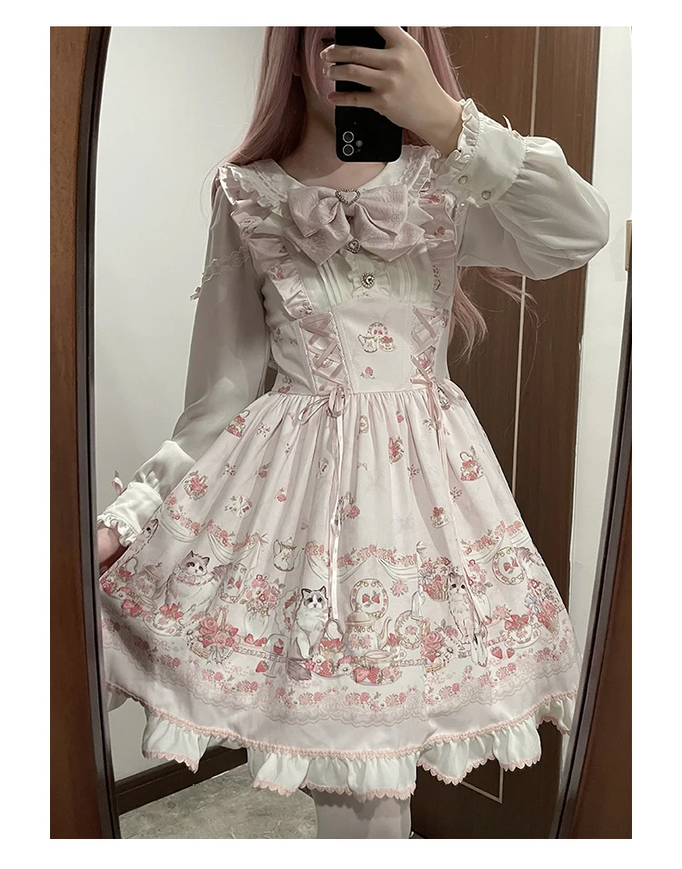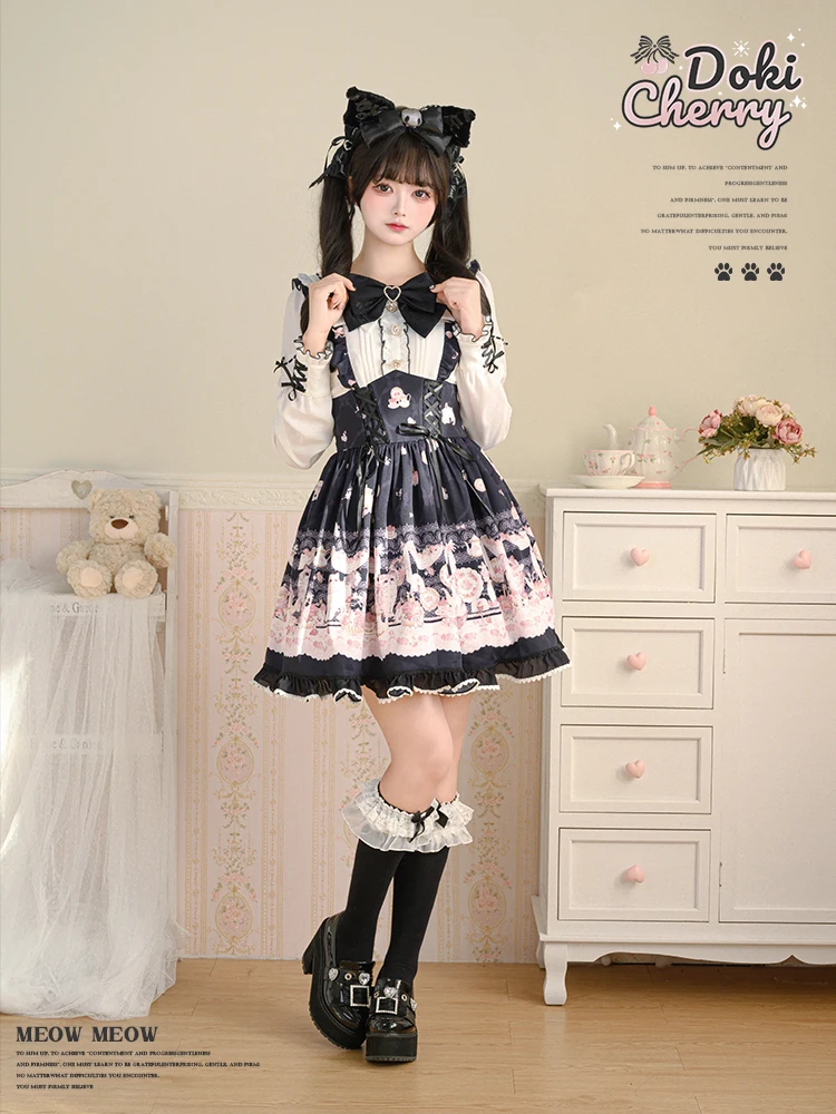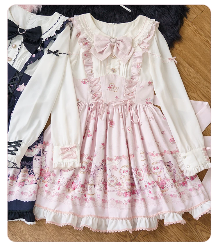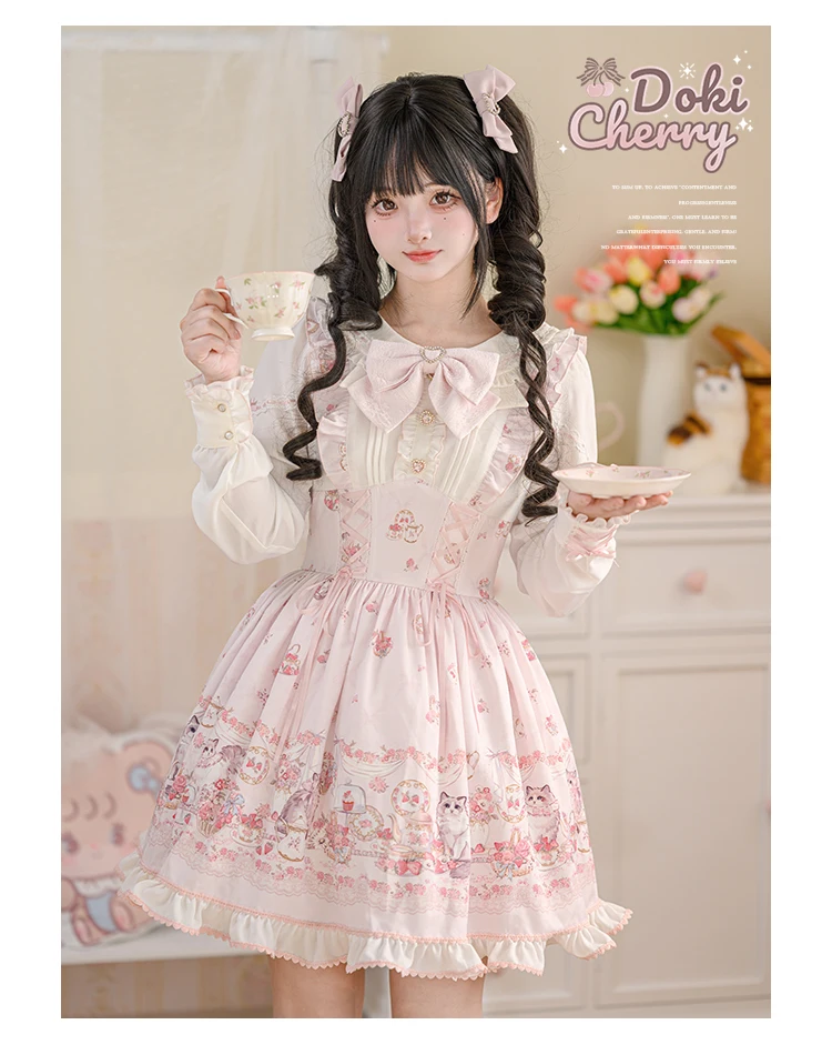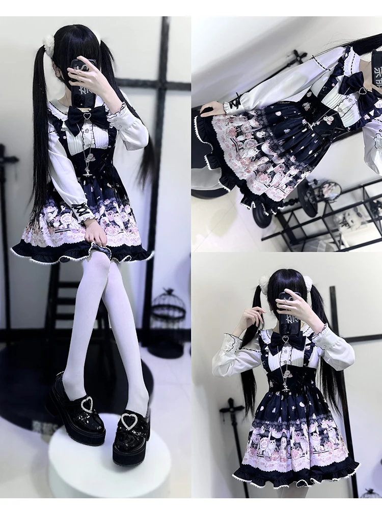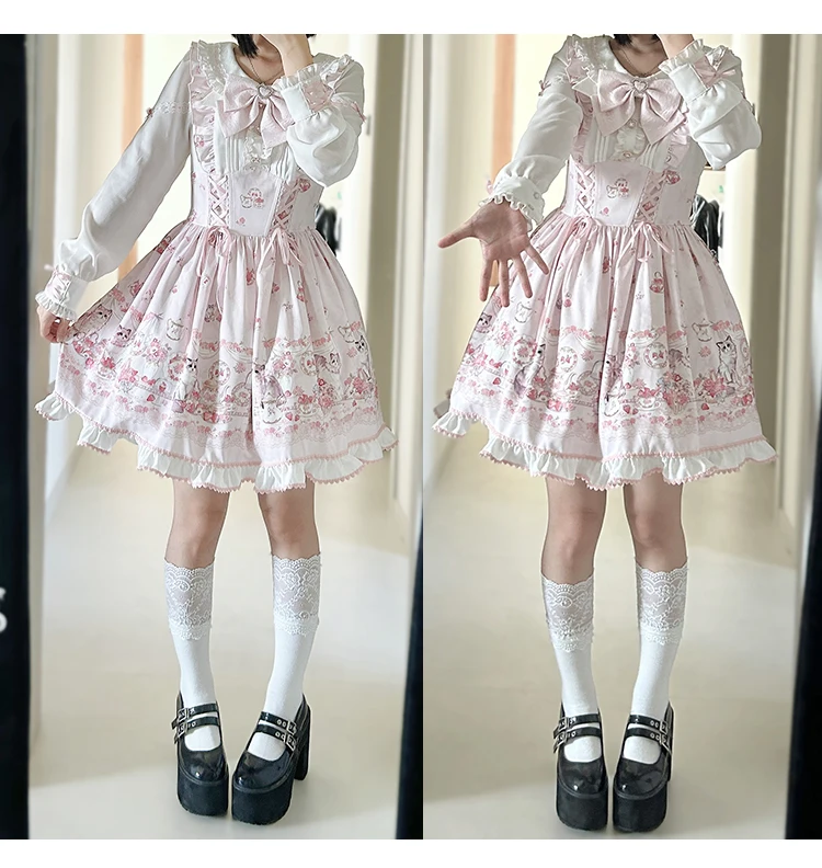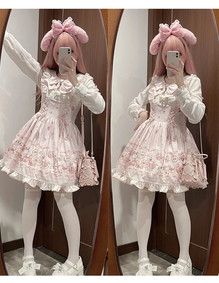 Japanese Mine Style Mass-produced Kawaii Lolita Dress Doll Collar Bow Long Sleeve High Waist Cute Print A-line Short Dress Women