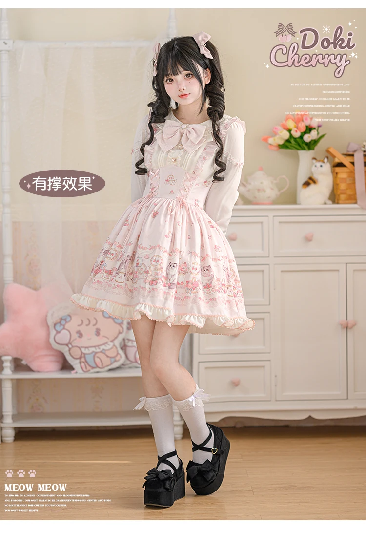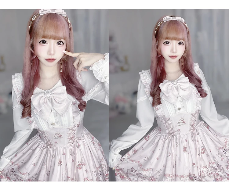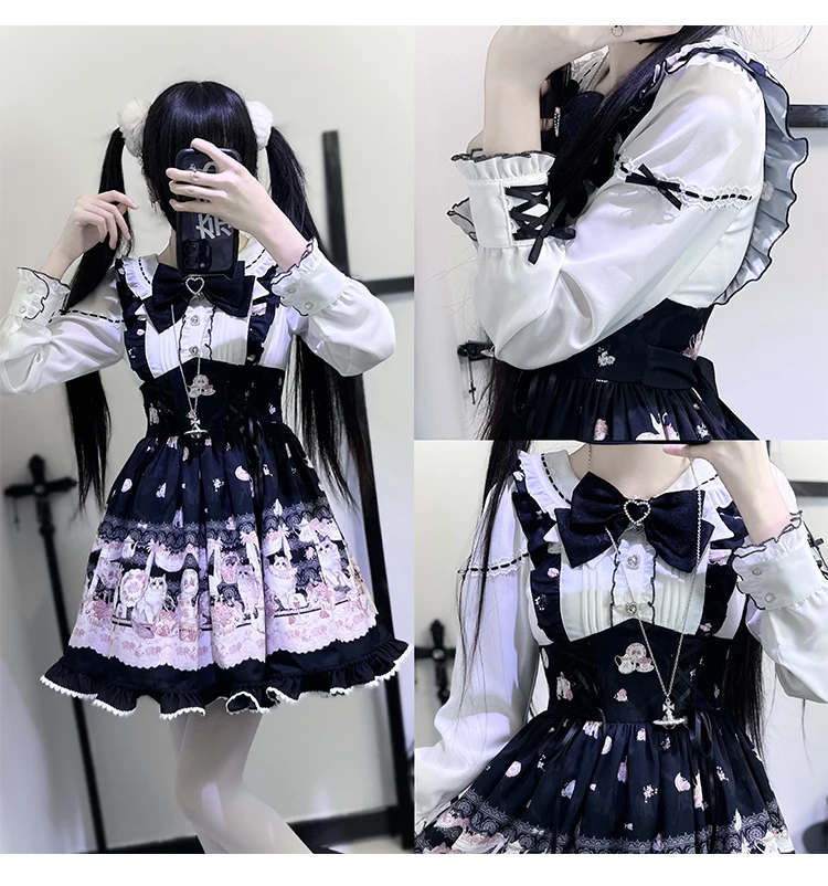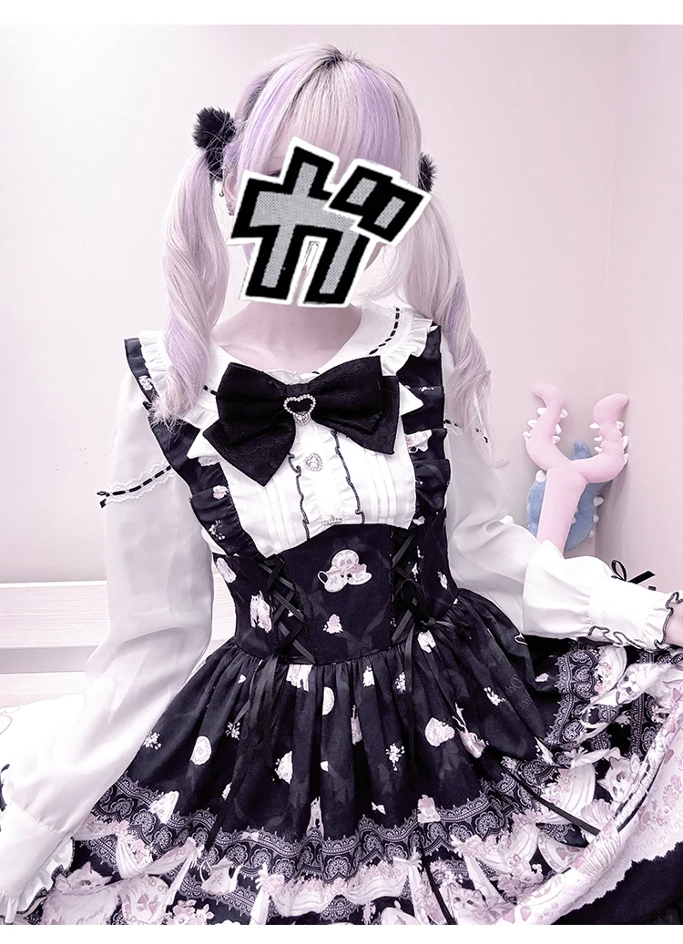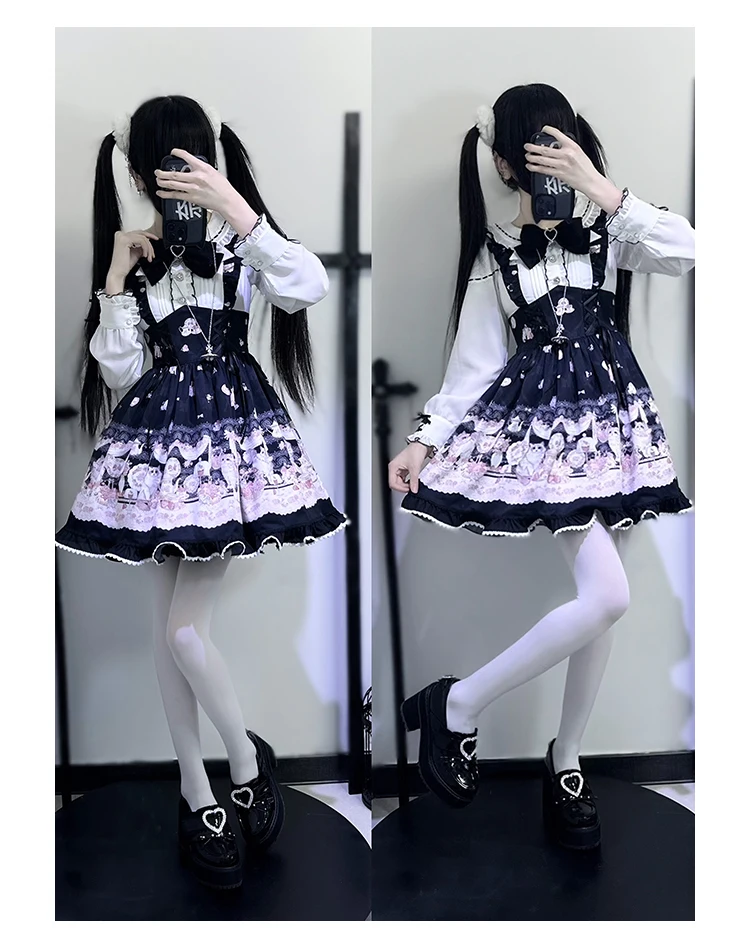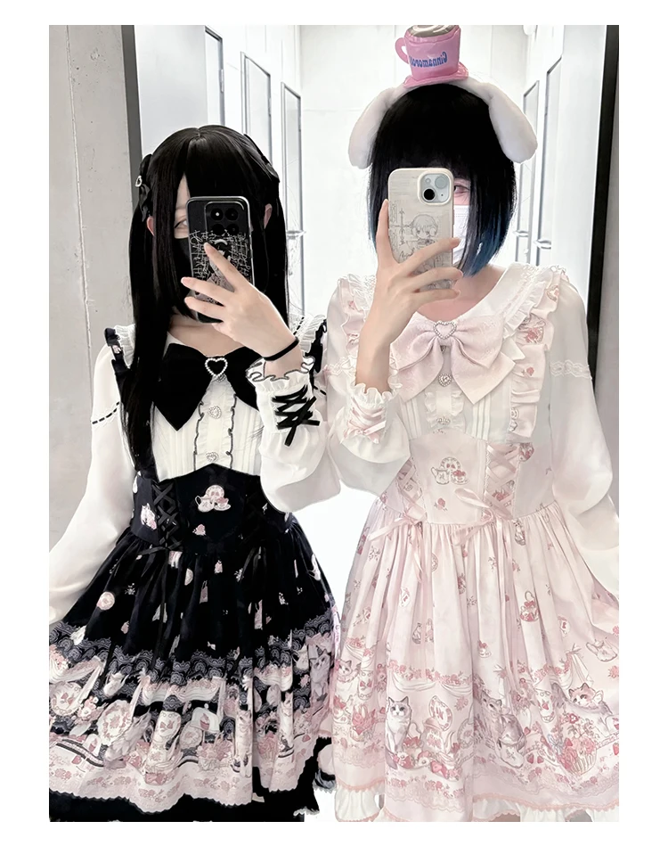 Japanese Mine Style Mass-produced Kawaii Lolita Dress Doll Collar Bow Long Sleeve High Waist Cute Print A-line Short Dress Women