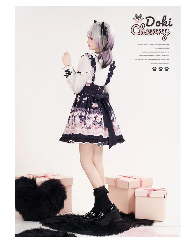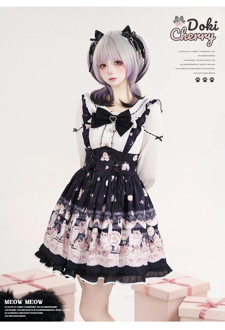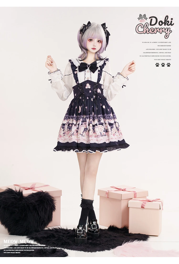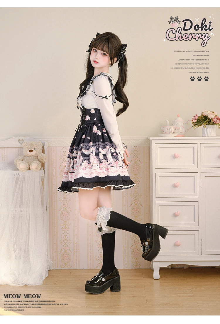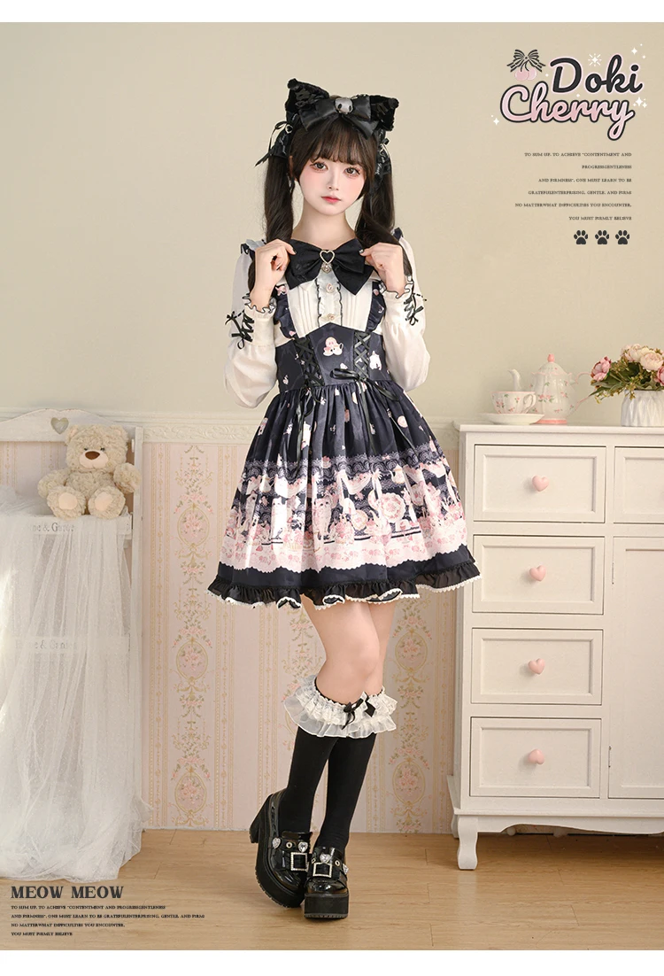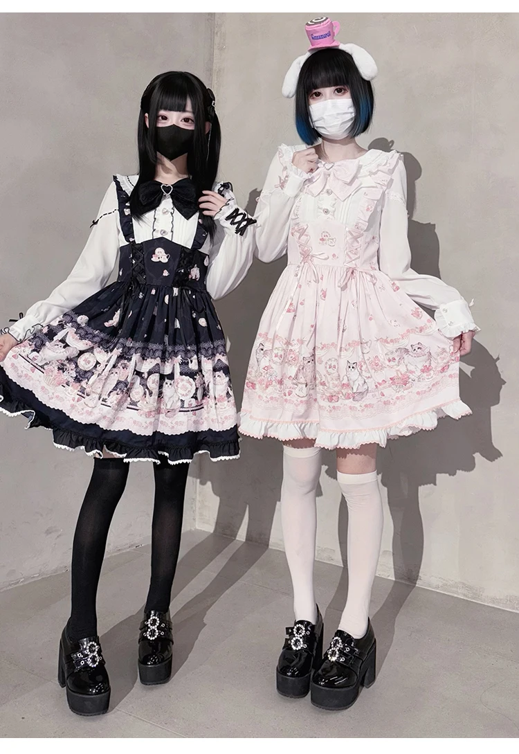 Japanese Mine Style Mass-produced Kawaii Lolita Dress Doll Collar Bow Long Sleeve High Waist Cute Print A-line Short Dress Women