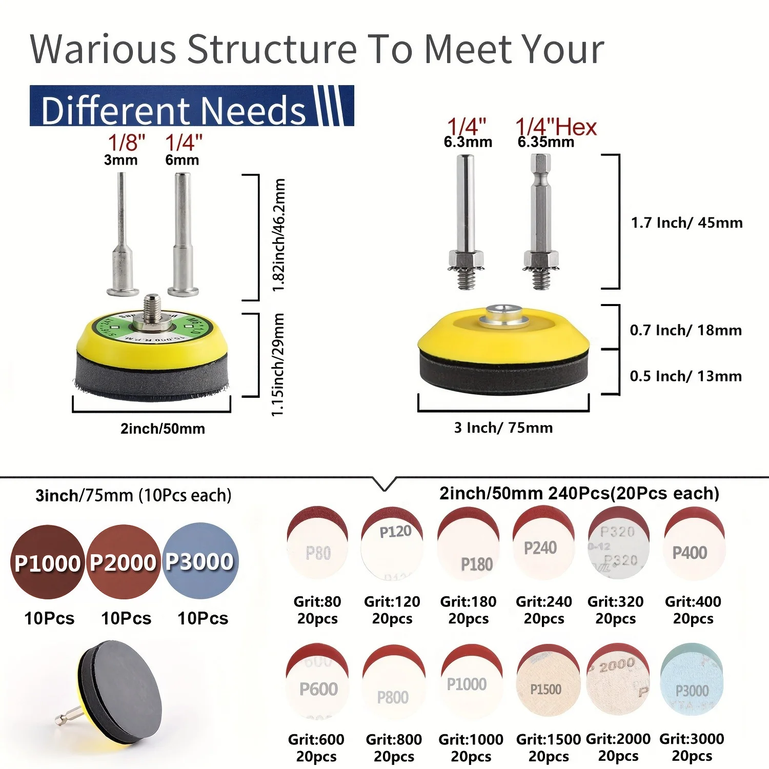 270pcs Sandpaper Set 2-3 inch 80-3000# Sanding Discs Abrasive Paper with 1/8" & 1/4"Abrasive Polishing Pad for Dremel Tools