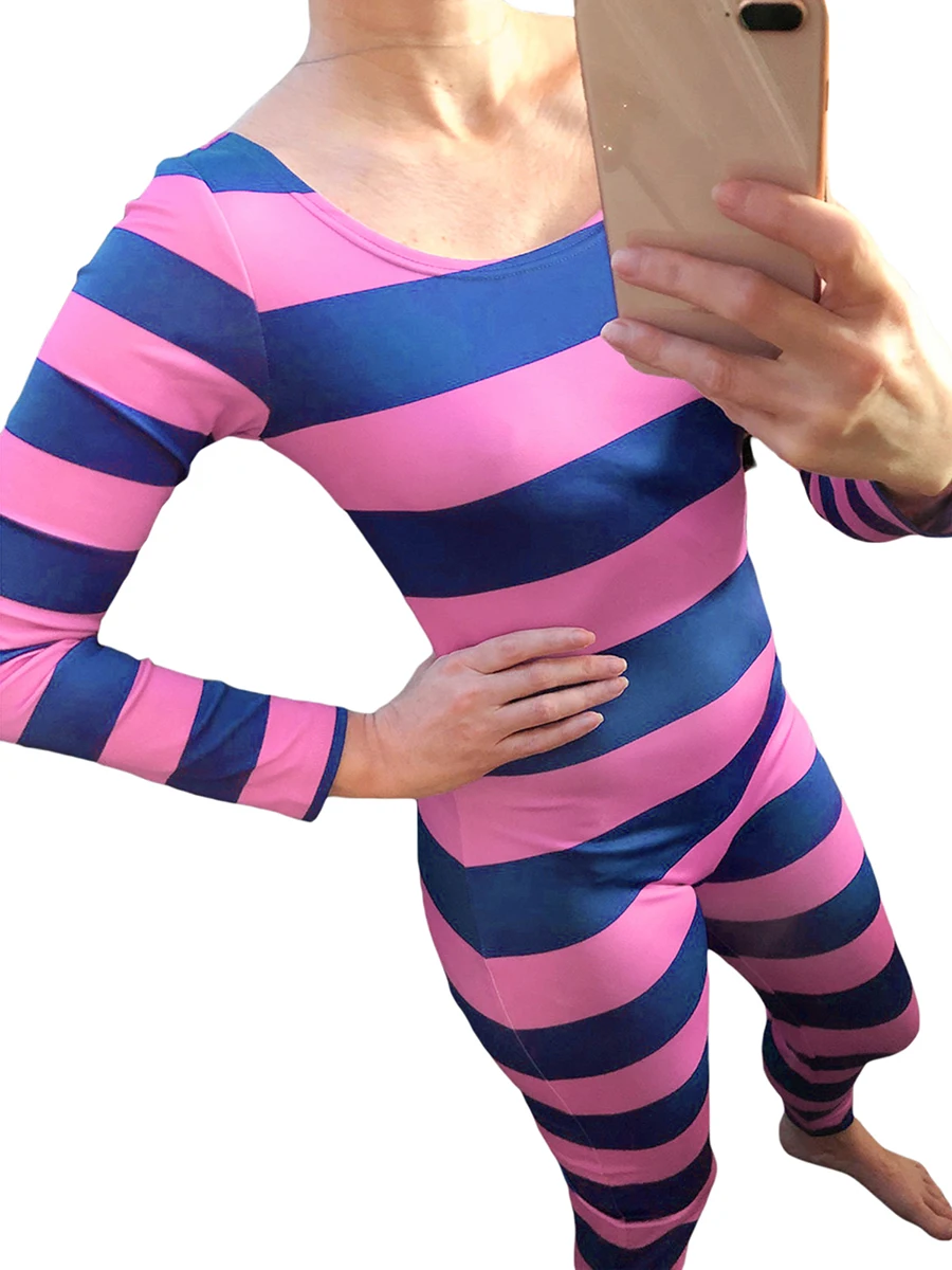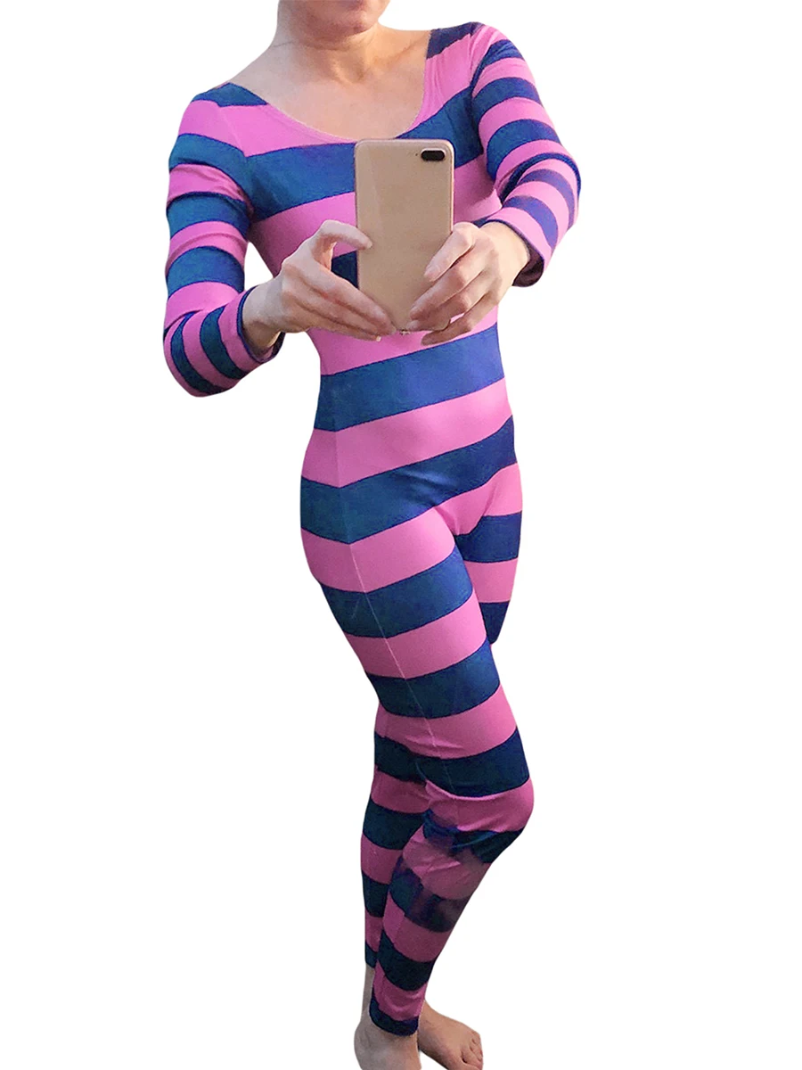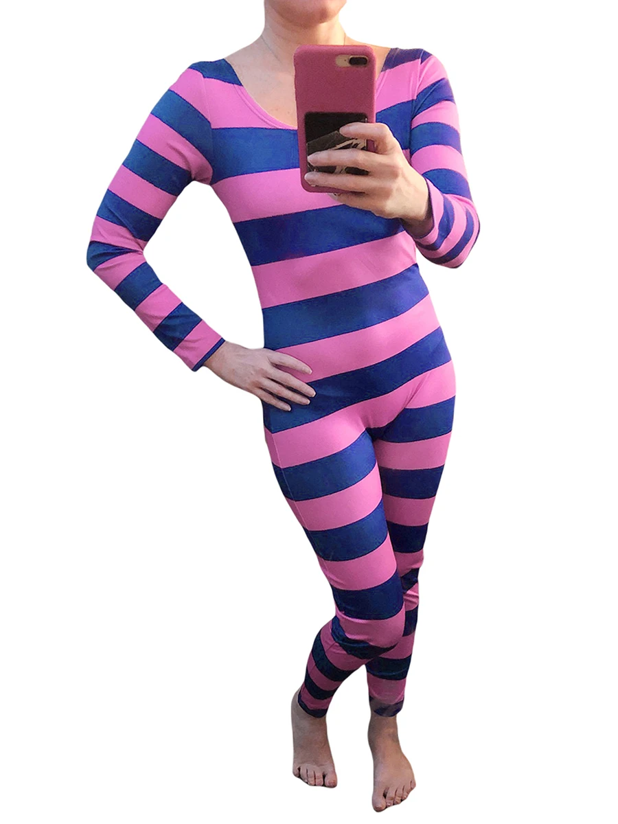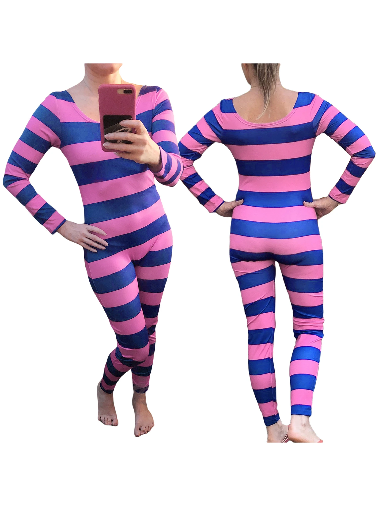Women's Cheshire Cat Halloween Costume --- Cheshire cat inspired long sleeve striped pink and purple cosplay cat suit for women, very comfortable and stretchable, lightweight and soft. Flattering silhouette jumpsuits, is great for comic con, Halloween costume, Cosplay outfit, themed birthday party, gymnastics, or as a comfortable everyday indoor or outdoor wear. Fits true to size, but please use the available size chart to ensure a great fit. Make it as a great gift.