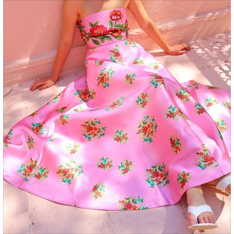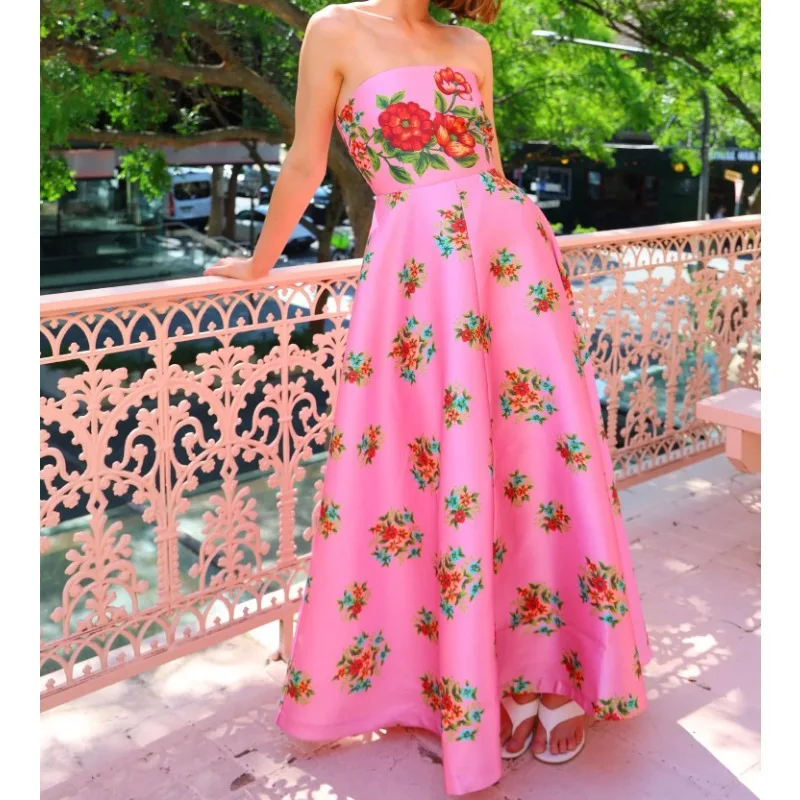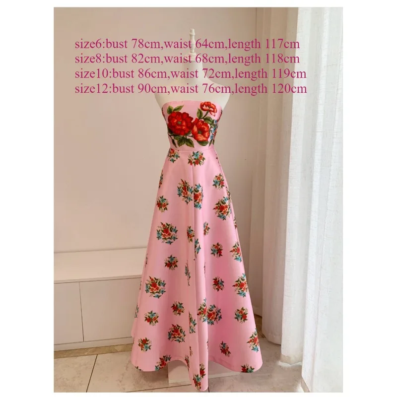 Appliqued Midi Dress for Women 2025 Spring Summer High Qaulity Pink Floral Print Long Sleeve Flowers