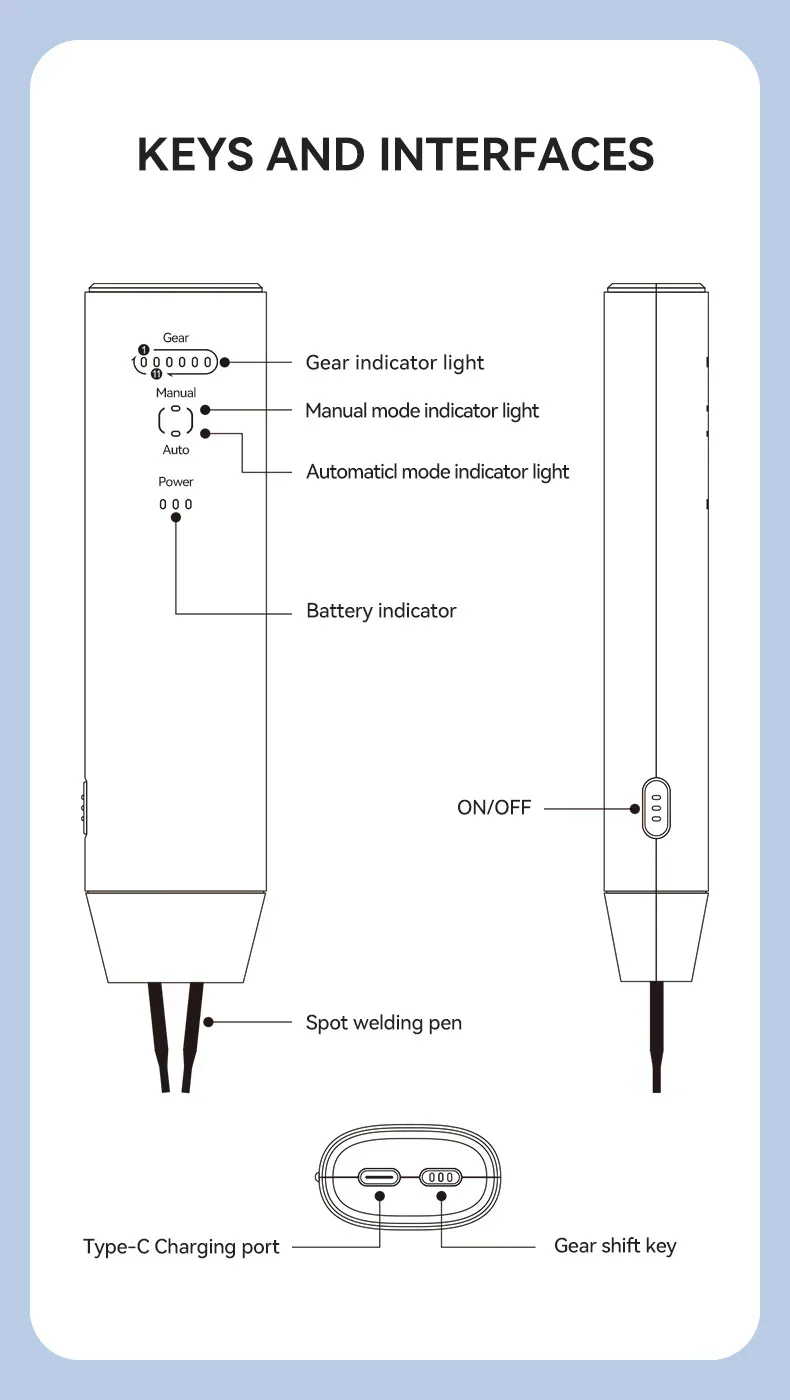 3. Easy to use - only 2 buttons, and our spot welding machine buttons come with labels for easy use. The battery spot welding machine does not need to leave our palms. Press and hold the power switch button on the side with your middle finger for 2 seconds, press and hold the gear adjustment button on the top with your index finger once, and then press and hold for 2 seconds to adjust the automatic or manual mode.
