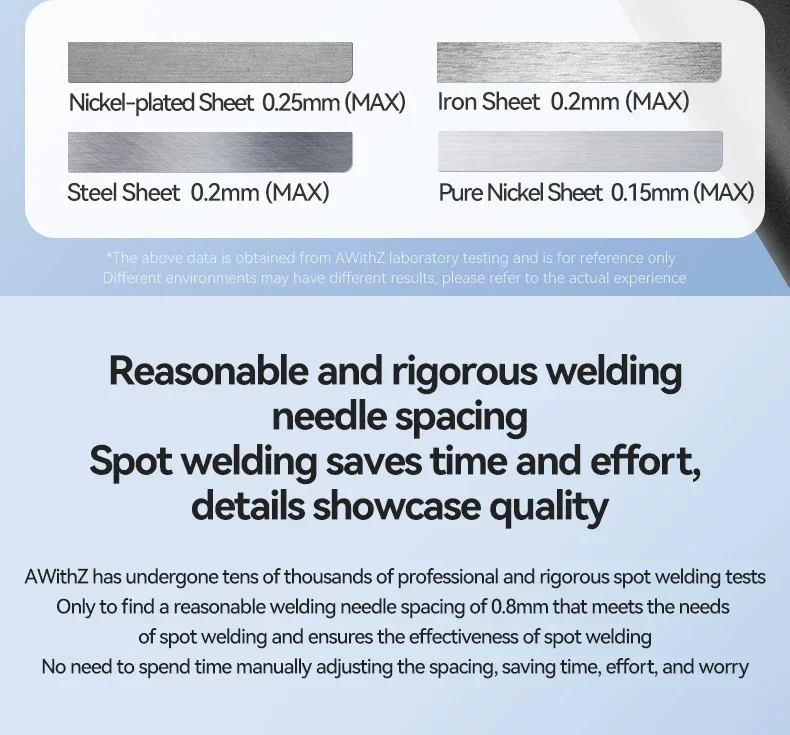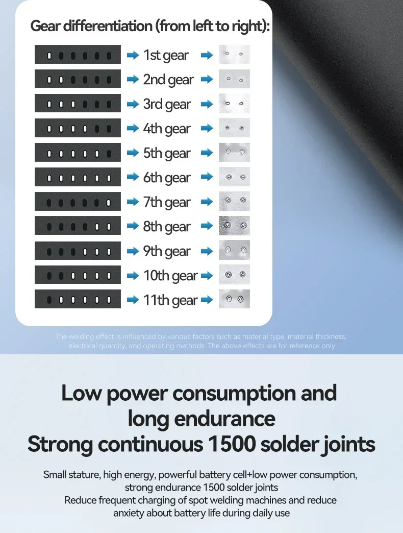 4.11 Level Adjustable - This spot welding machine has 11 levels of adjustable output power, which can be adjusted according to the different materials you spot weld. 1-3 level mobile phone battery, 3-6 level 0.1mm nickel plate, 6-11 level 0.12-0.15 nickel plate. One charge can spot weld more than 200 times.