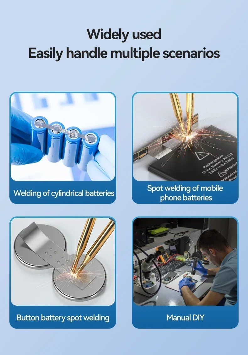 2. Widely used - suitable for cylindrical batteries such as 18650/26650/36650, mobile phone batteries, and electronic devices that require batteries. Spot welding machines can be used for electronic devices that are damaged due to battery damage. After replacing the battery, it can be restored to use (similar to a handheld drill), which is both economical and environmentally friendly.