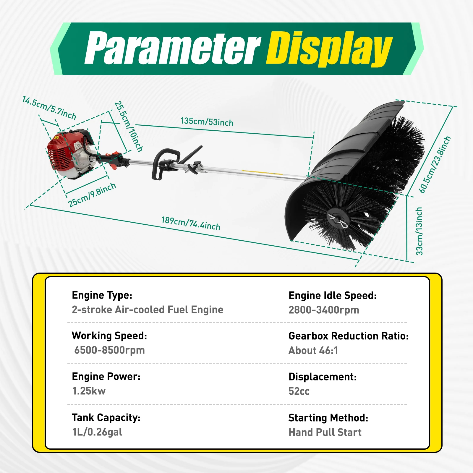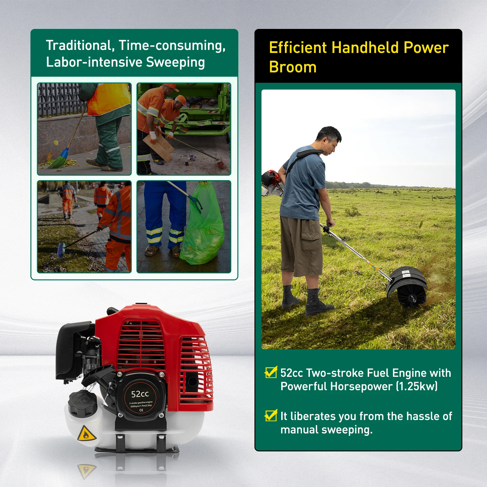 Great Power: With its two-stroke fuel engine, this sweeper has a powerful horsepower(1.25 kw) which allows it to clean large areas quickly and efficiently to save more valuable time and make sweeping an enjoyable experience.