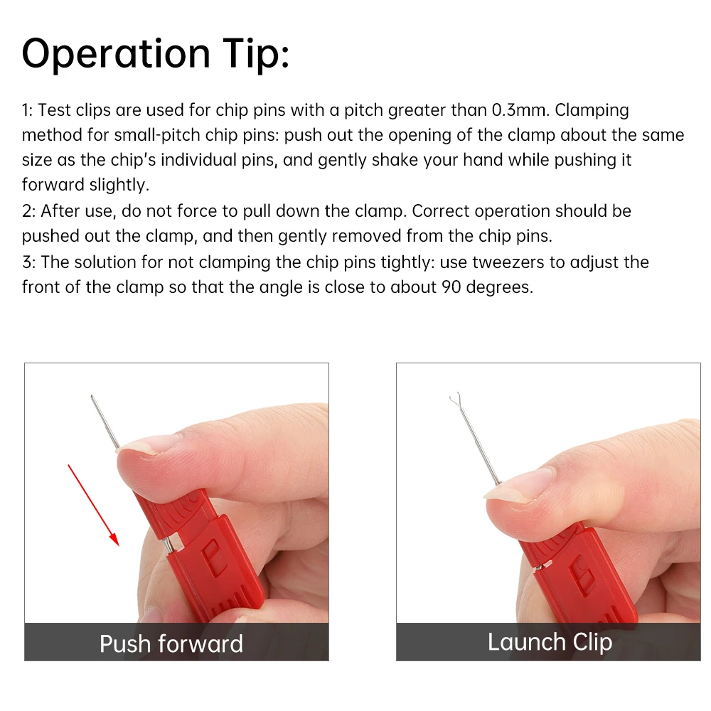 2: After use, do not force to pull down the clamp. Correct operation should be pushed out the clamp, and then gently removed from the chip pins.
