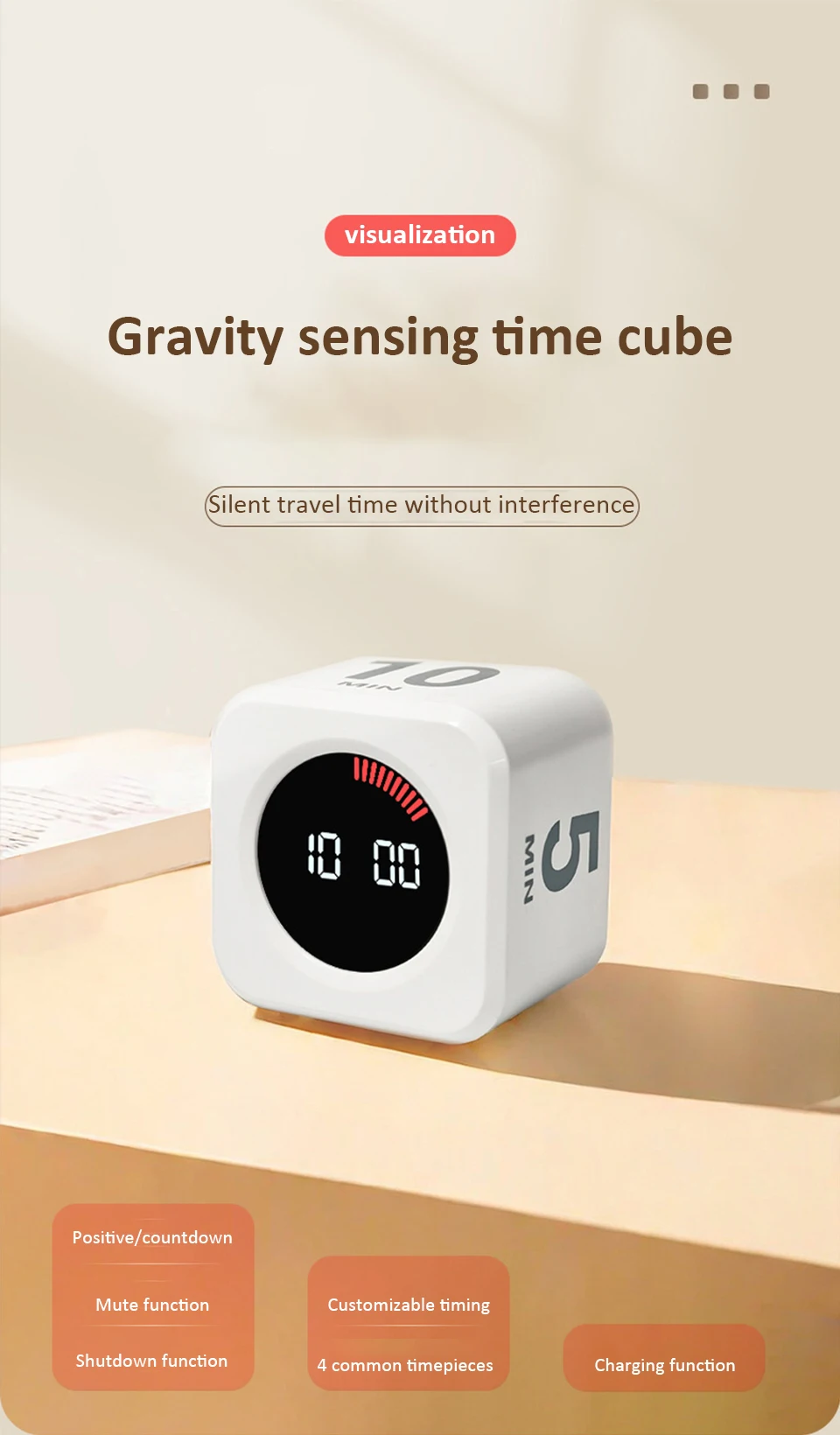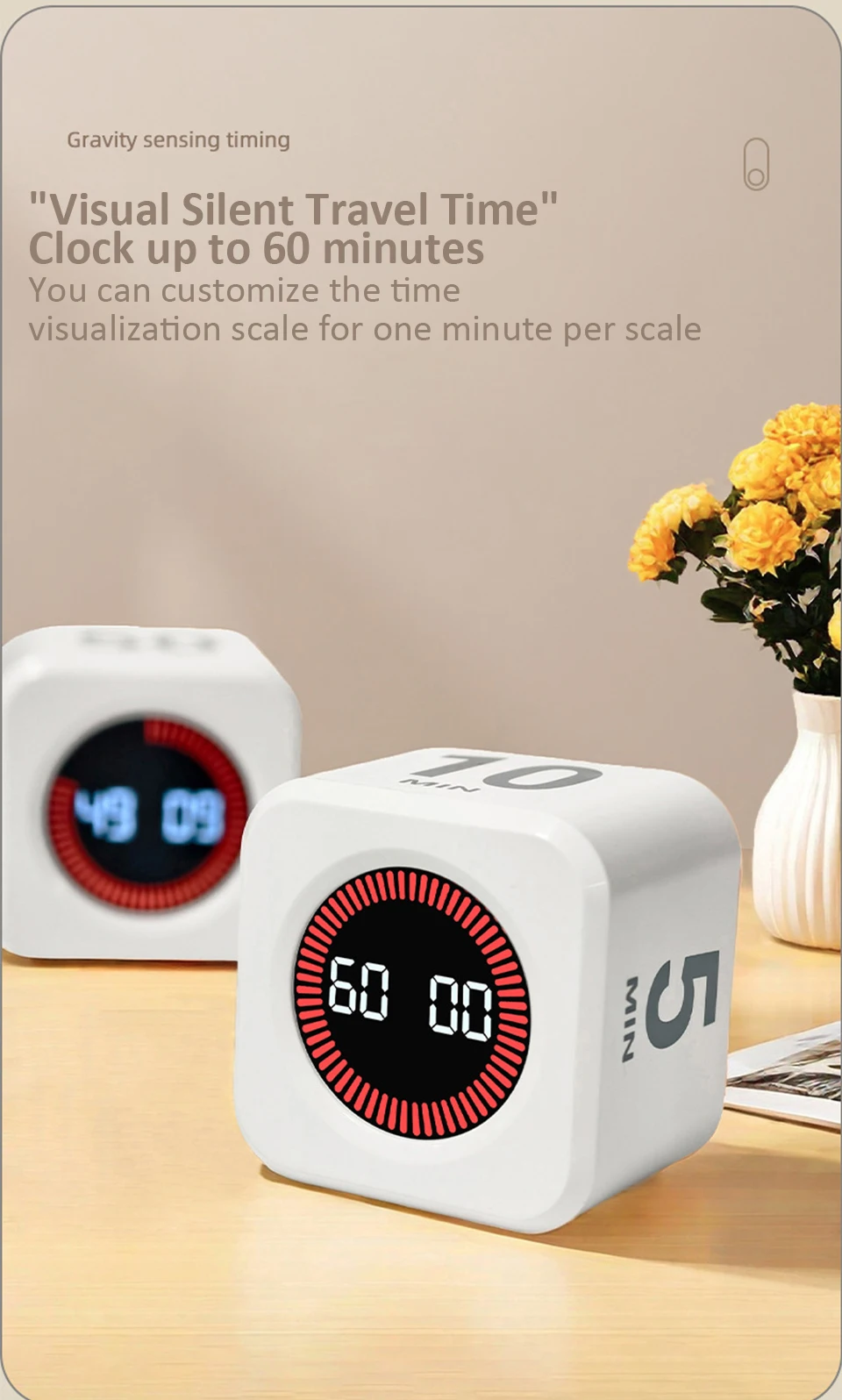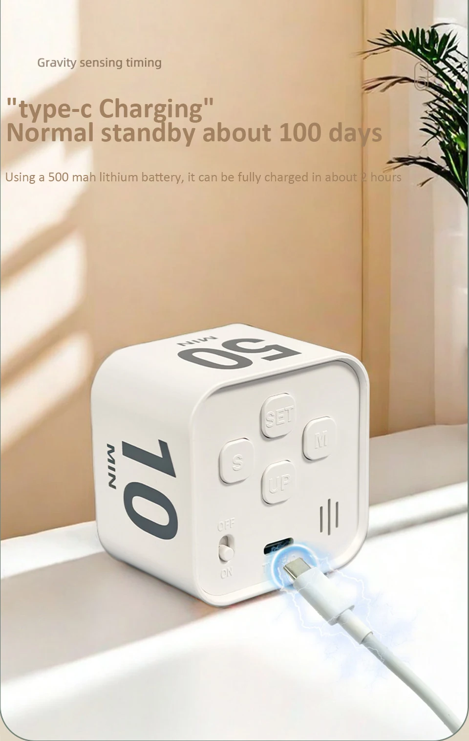 Digital Visual Timer Gravity Sensor Flipping LED Display 4 Preset Time Rechargeable Mini Cube Timer for Cooking Study Shower