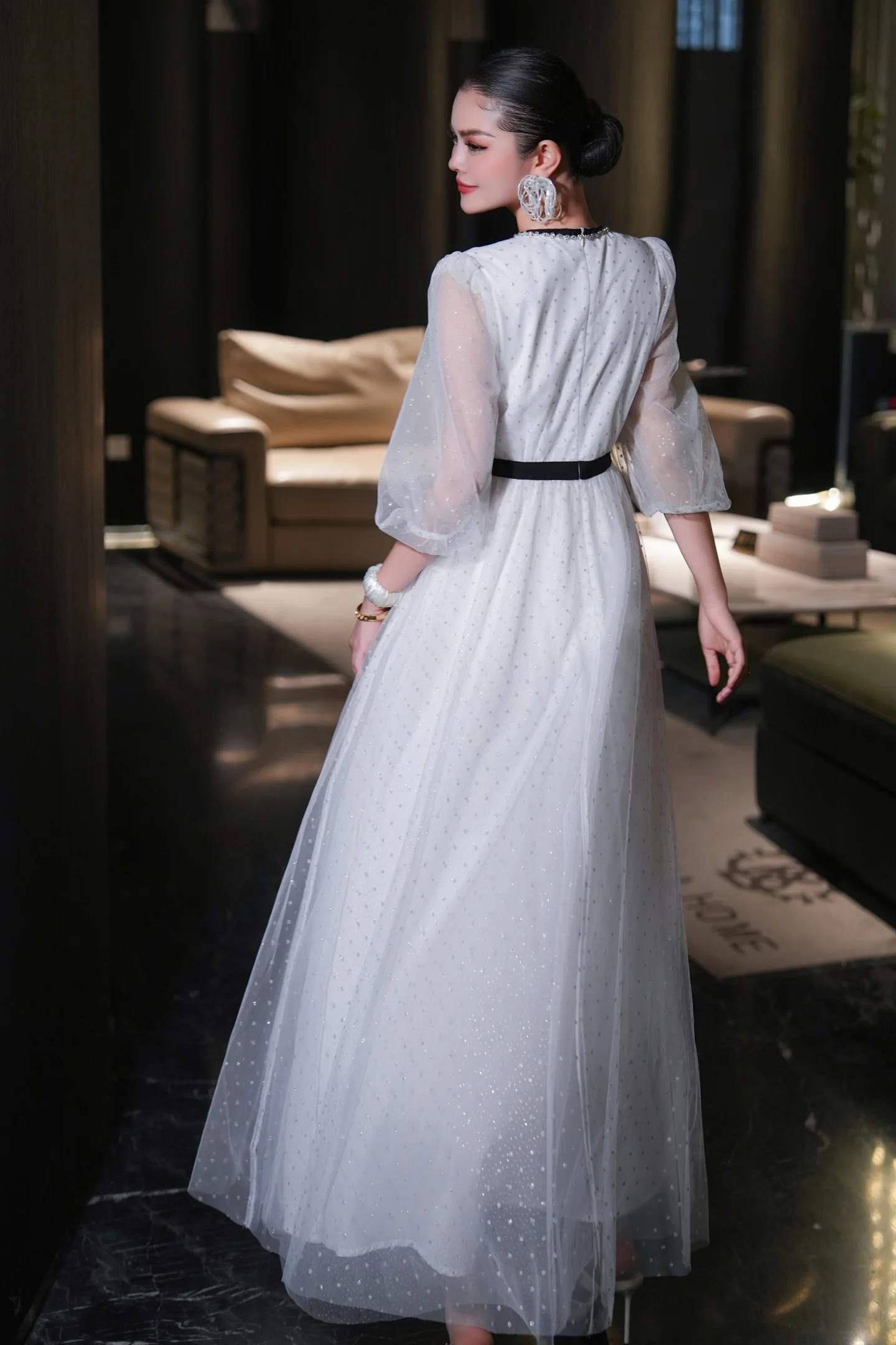 This ZJYT dress features an elegant diamond mesh fabric, V-neckline, and three-quarter sleeves, perfect for summer proms and parties.