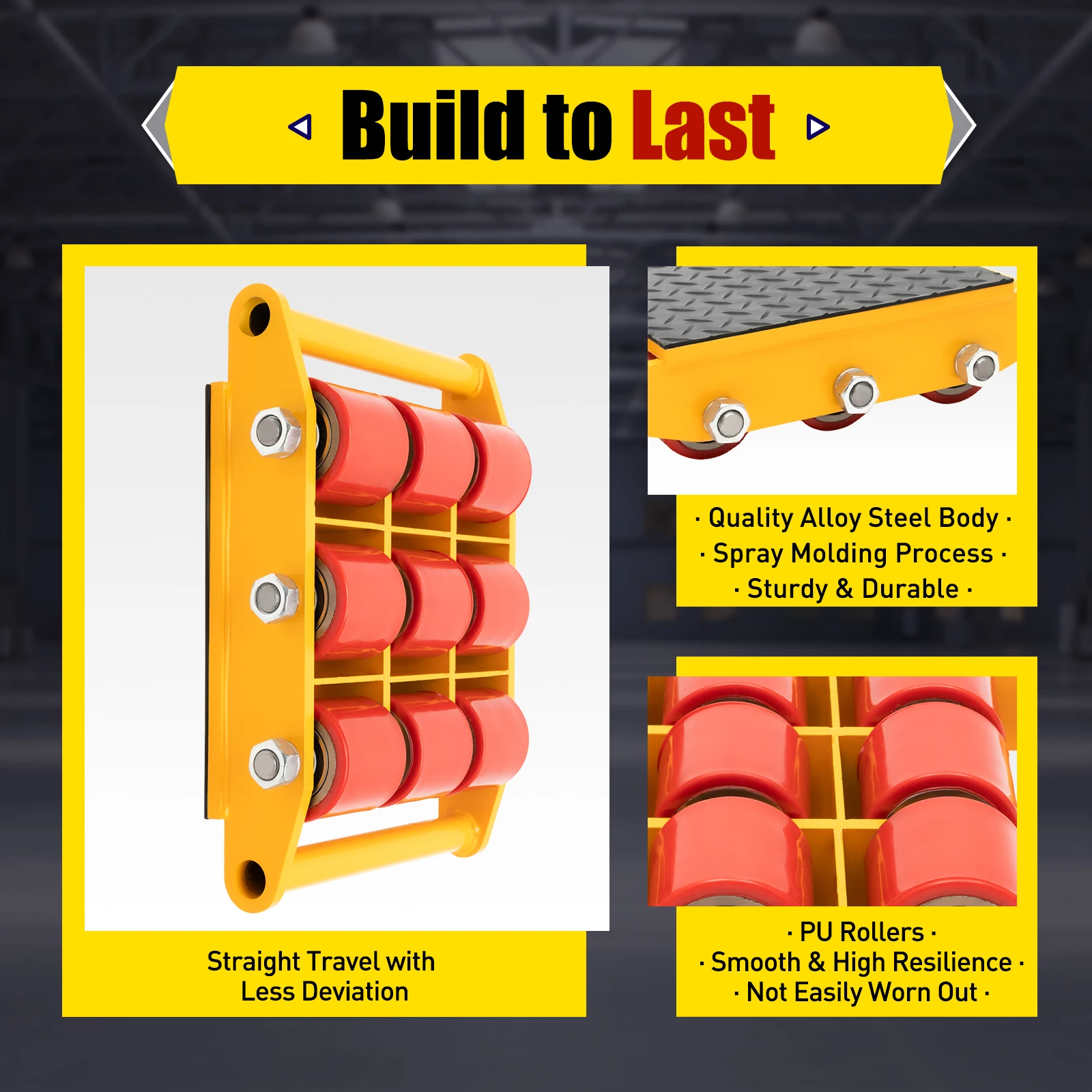 The machinery mover is made of alloy steel, which is more durable and highly corrosion-resistant. It provides 33069.34lbs loading capacity so that it can easily carry heavy goods and equipment. It is suitable for distributing and transporting large and heavy items for domestic, industrial, and commercial applications.