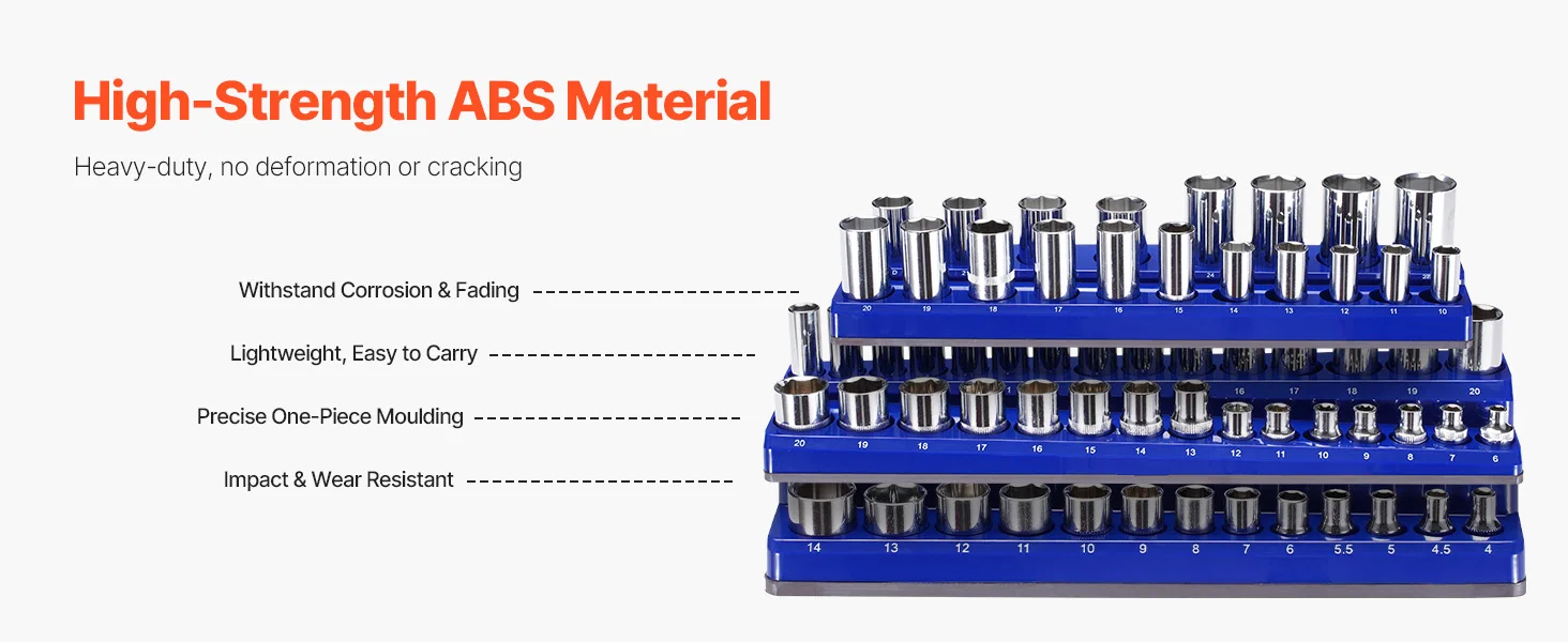 Built to Last: Made from reinforced ABS material, our socket organizer tray resists impact and wear. The clear size labels won’t fade over time, ensuring long-lasting convenience.