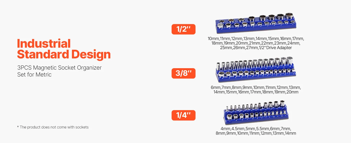 High Compatibility: Designed to be compatible with multiple socket brands, our 3PCS magnetic socket organizer set holds up to 75pcs metric standard and deep sockets, simplifying sockets management, keeping the workspace clean and ensuring you won't lose any sockets. (Note: Sockets are not included.)