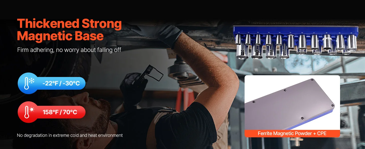 Strong Magnetic Base: Featuring a robust 5mm thick magnetic base composed of ferrite and CPE, our socket organizers for toolbox provides strong, stable attachment to metal surfaces, keeping sockets trays firmly in place without slipping.