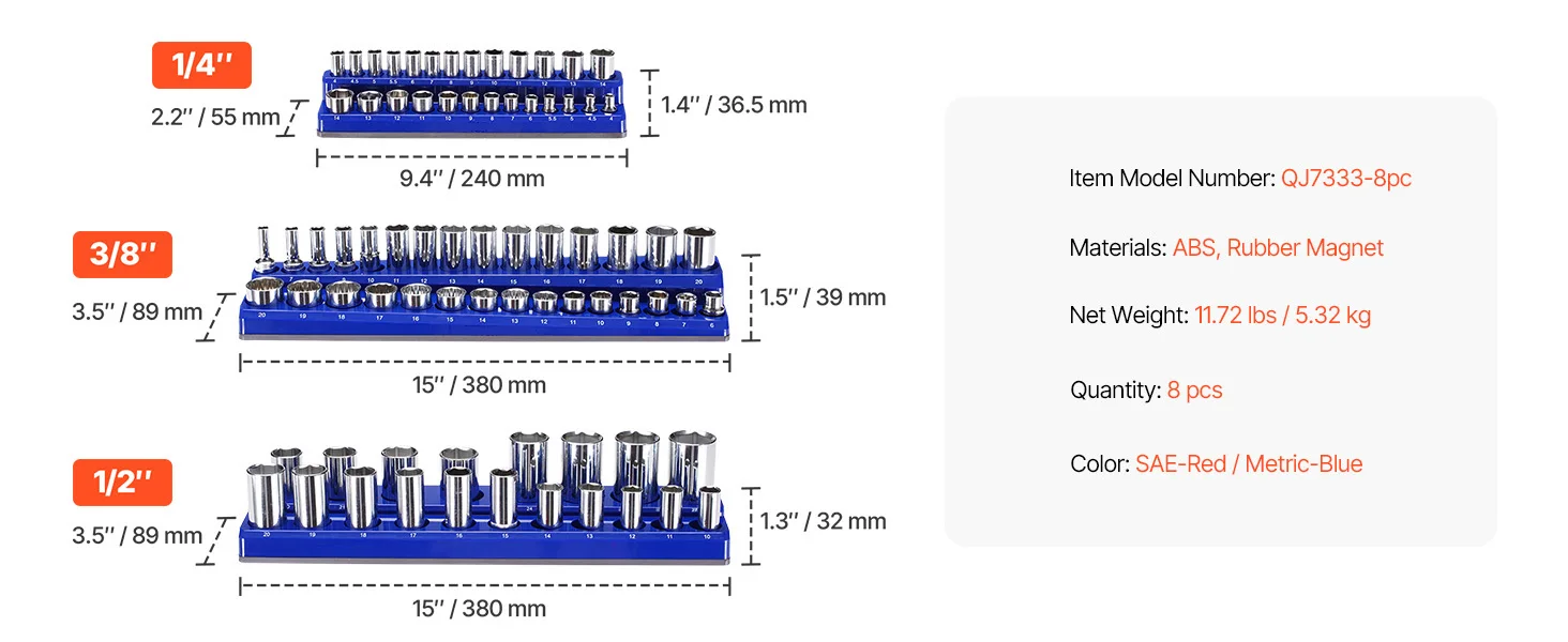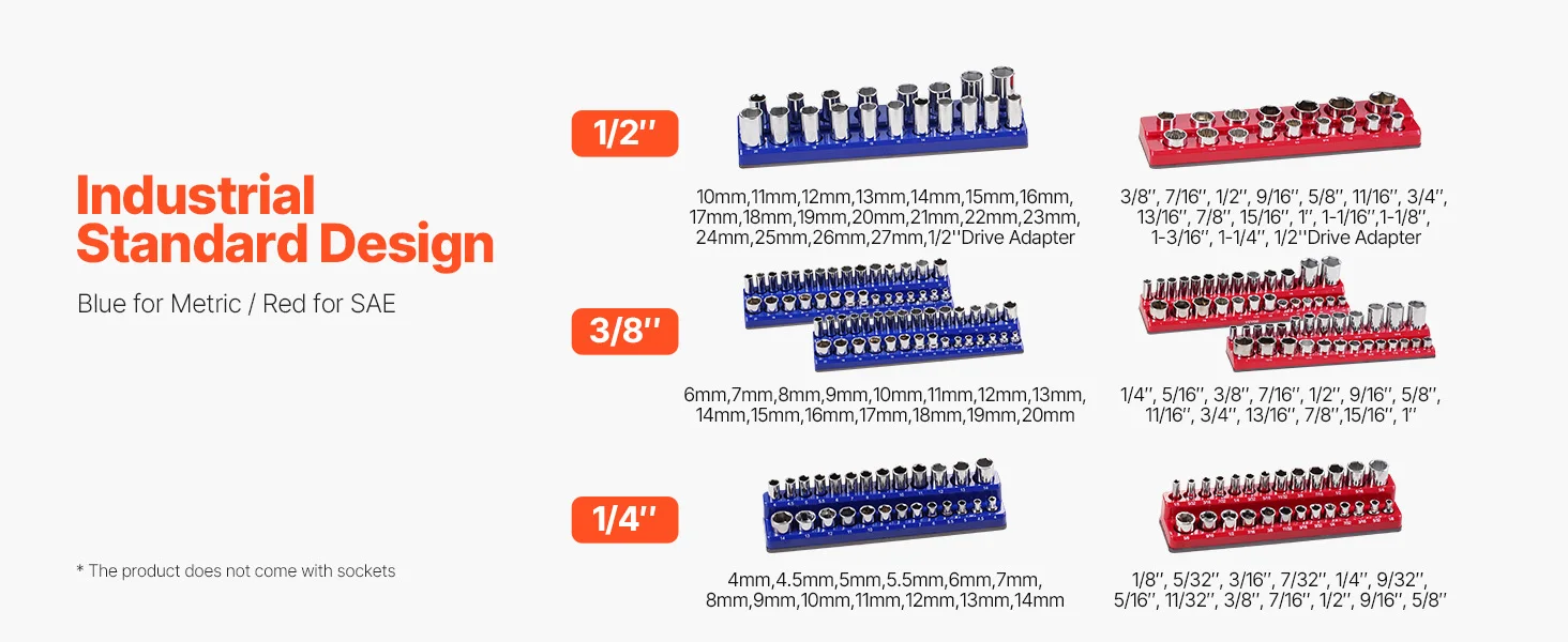 • Professional Design: Our socket organizer holders feature 2 colors: blue for metric and red for SAE. The set includes 143 slots, suitable for SAE sizes from 1/8" to 5/8" (1/4" drive), 1/4" to 1" (3/8" drive), and 3/8'' to 1-1/4'' with a 1/2'' drive adapter (1/2'' drive); metric sizes from 4 to 14mm (1/4" drive), 6 to 20mm (3/8" drive), and 10 to 27mm with a 1/2'' drive adapter (1/2'' drive).