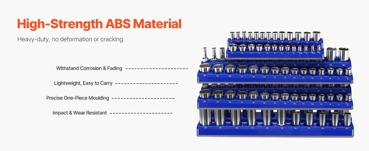 • Built to Last: Made from reinforced ABS material, our socket organizer tray resists impact and wear. The clear size labels won’t fade over time, ensuring long-lasting convenience.
