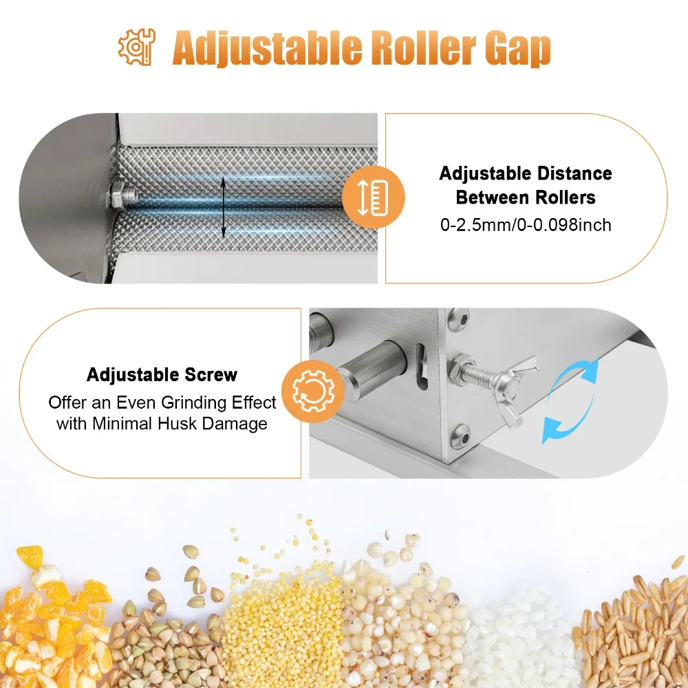Adjustable Roller Gap: By adjusting the screws, the gap between the two rollers can be adjusted(0-2.5mm) to the right position for an even grinding effect with minimal husk damage.