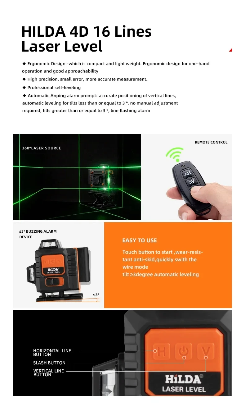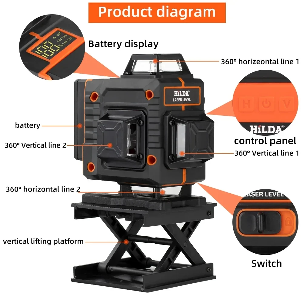 16 Lines 4D Ultra high Green Laser Level with Battery Display Self Leveling Horizontal & Vertical Cross Construction Tools
