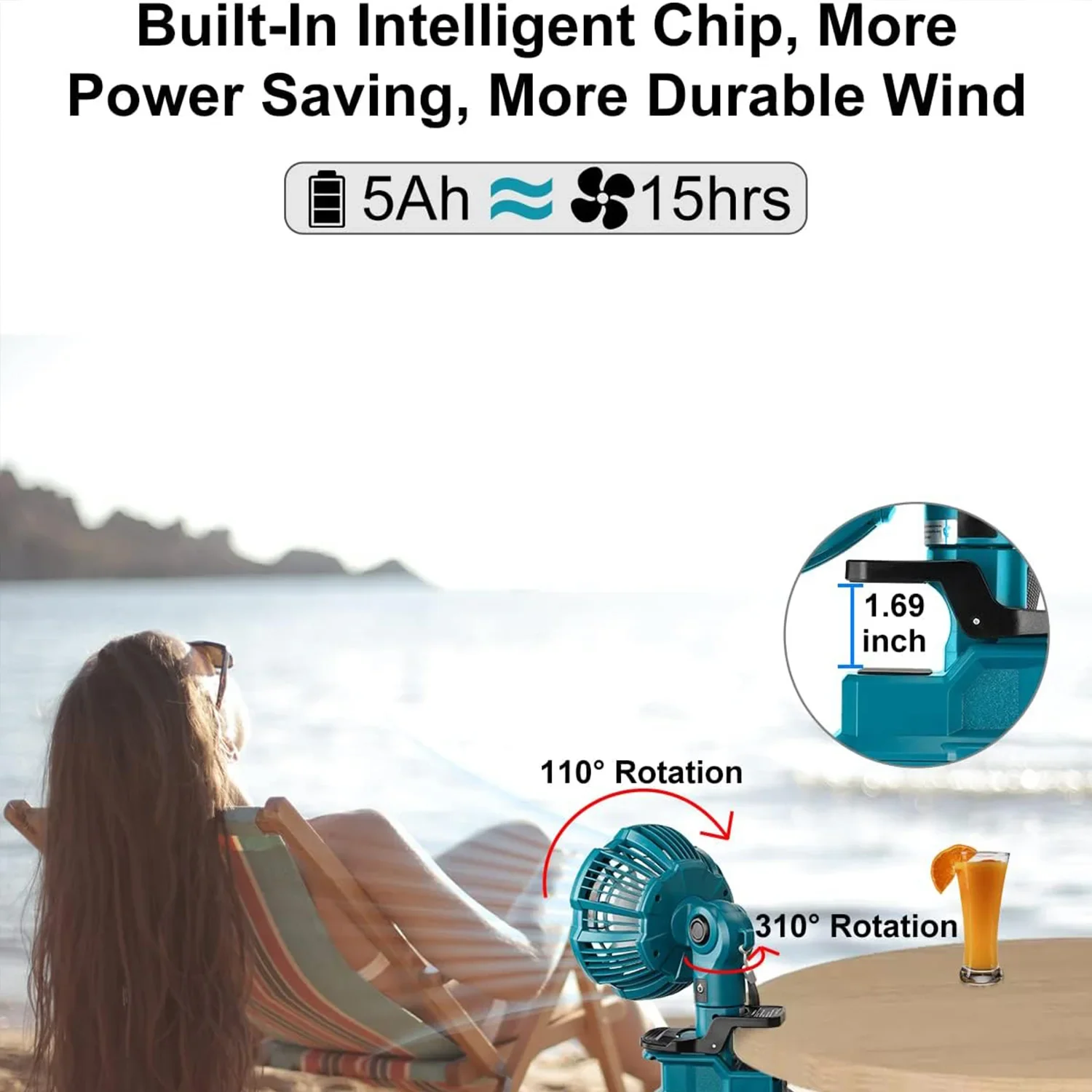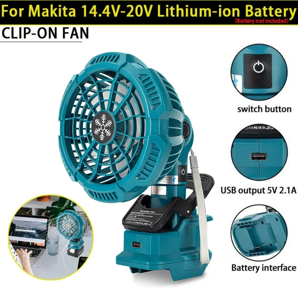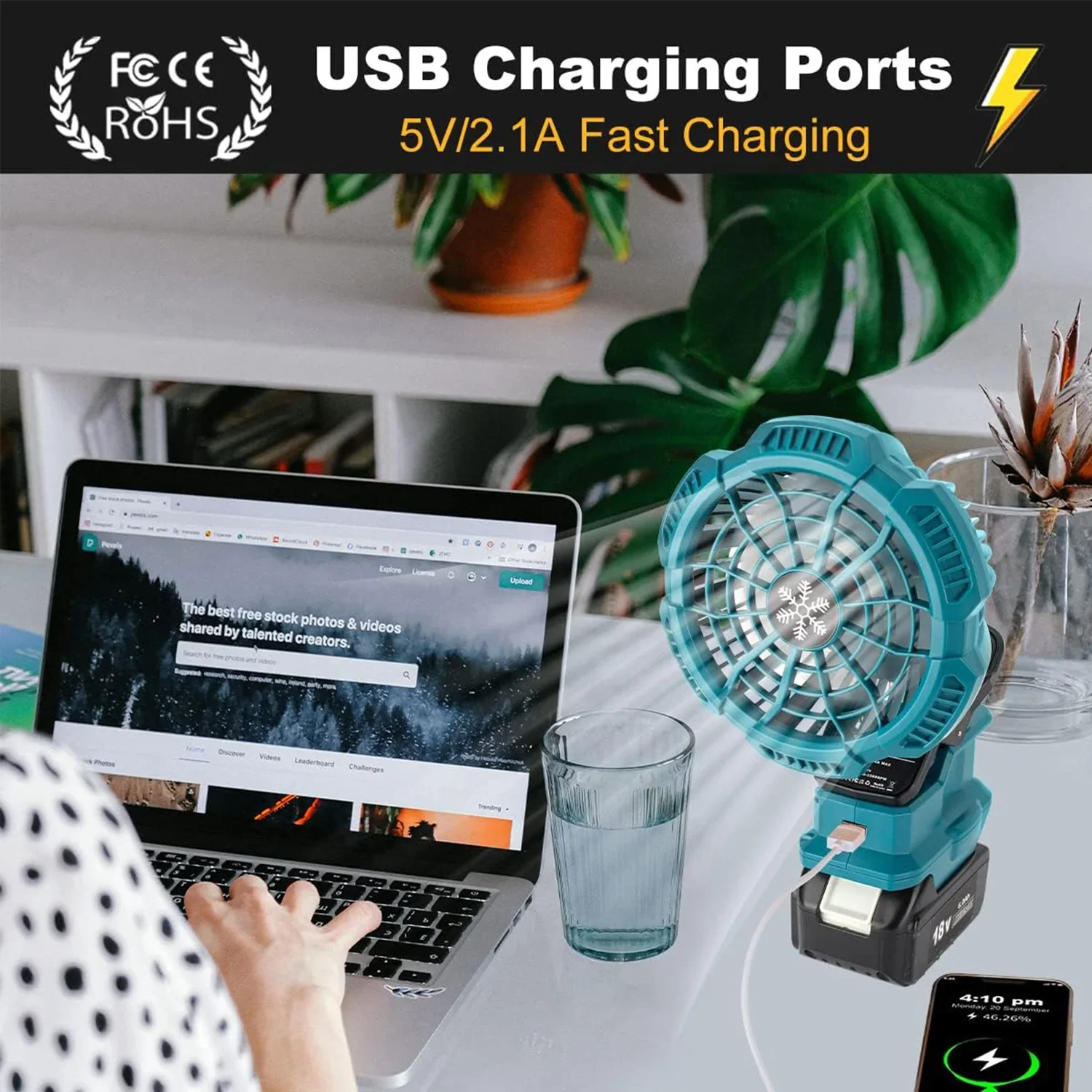 [18V Cordless Fan] - This 6.5-inch battery fan (blade diameter 4.25 inches) is perfectly compatible with Makita 14.4-20V lithium-ion batteries. If using a BL1850 5.0AH battery, this small fan can continuously deliver cool air for at least 15 hours. Equipped with a USB 5V/2.1A output power port, you can power your phone, camping lights, and other electronic devices. This is a must-have tool for you and your family to go out and have fun. (excluding batteries).