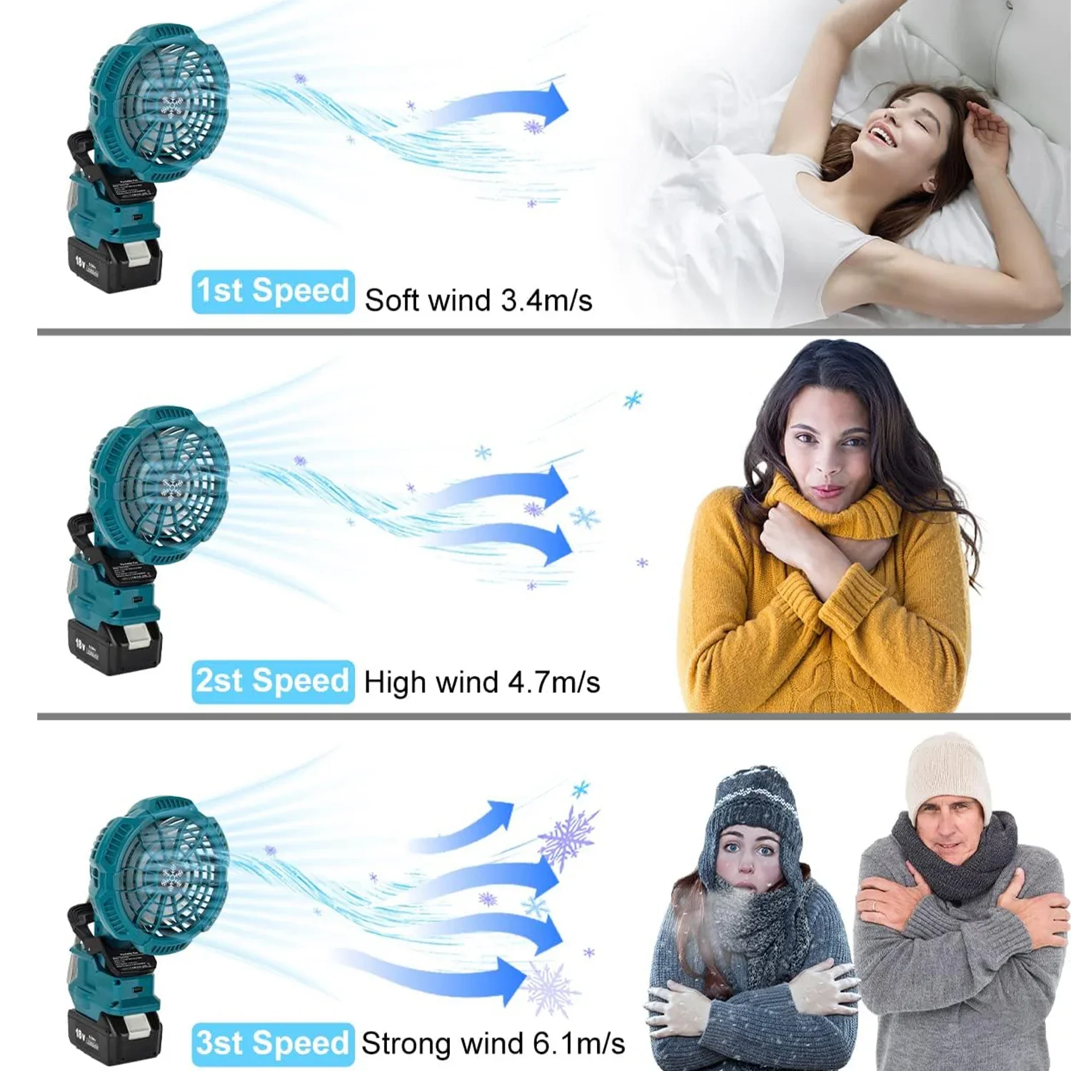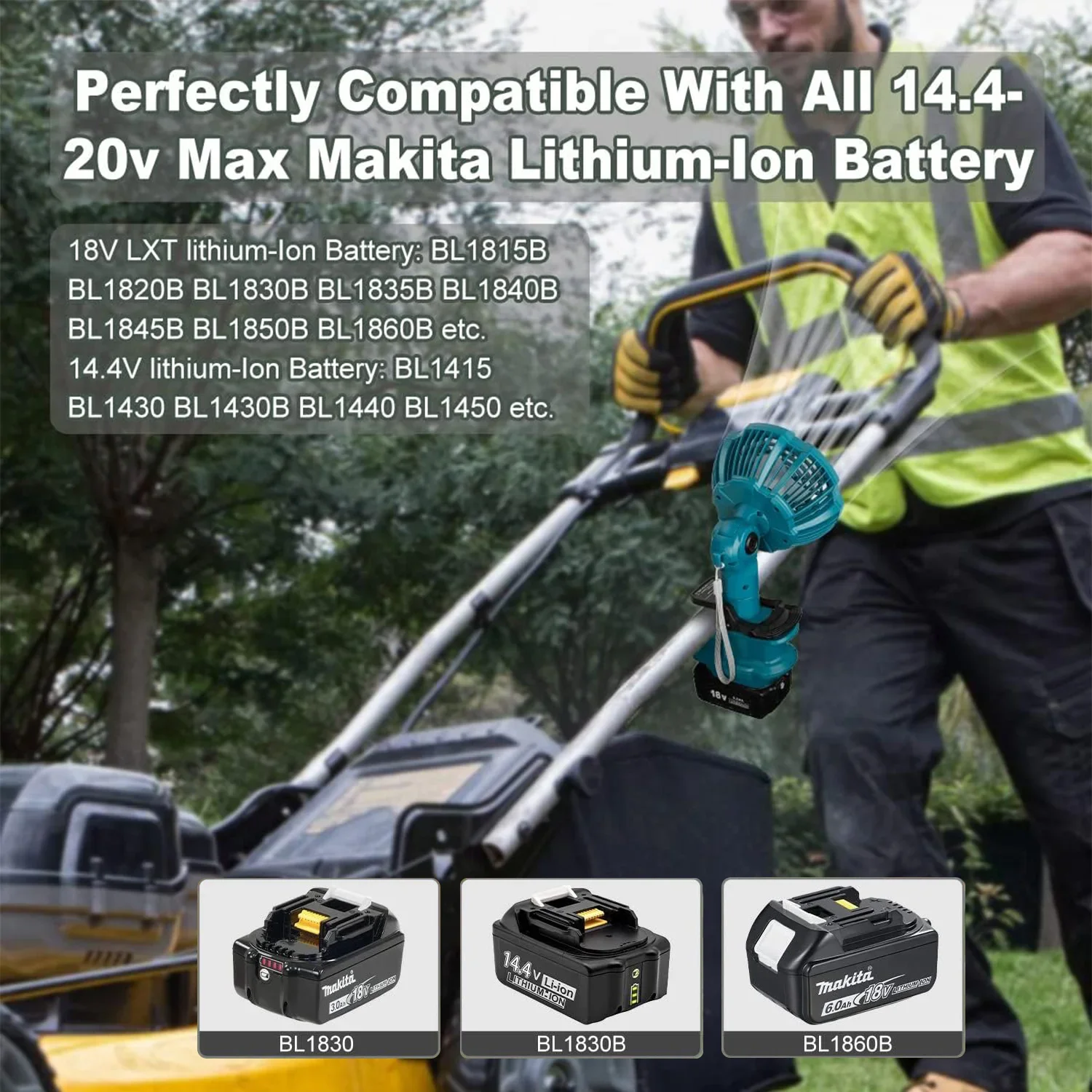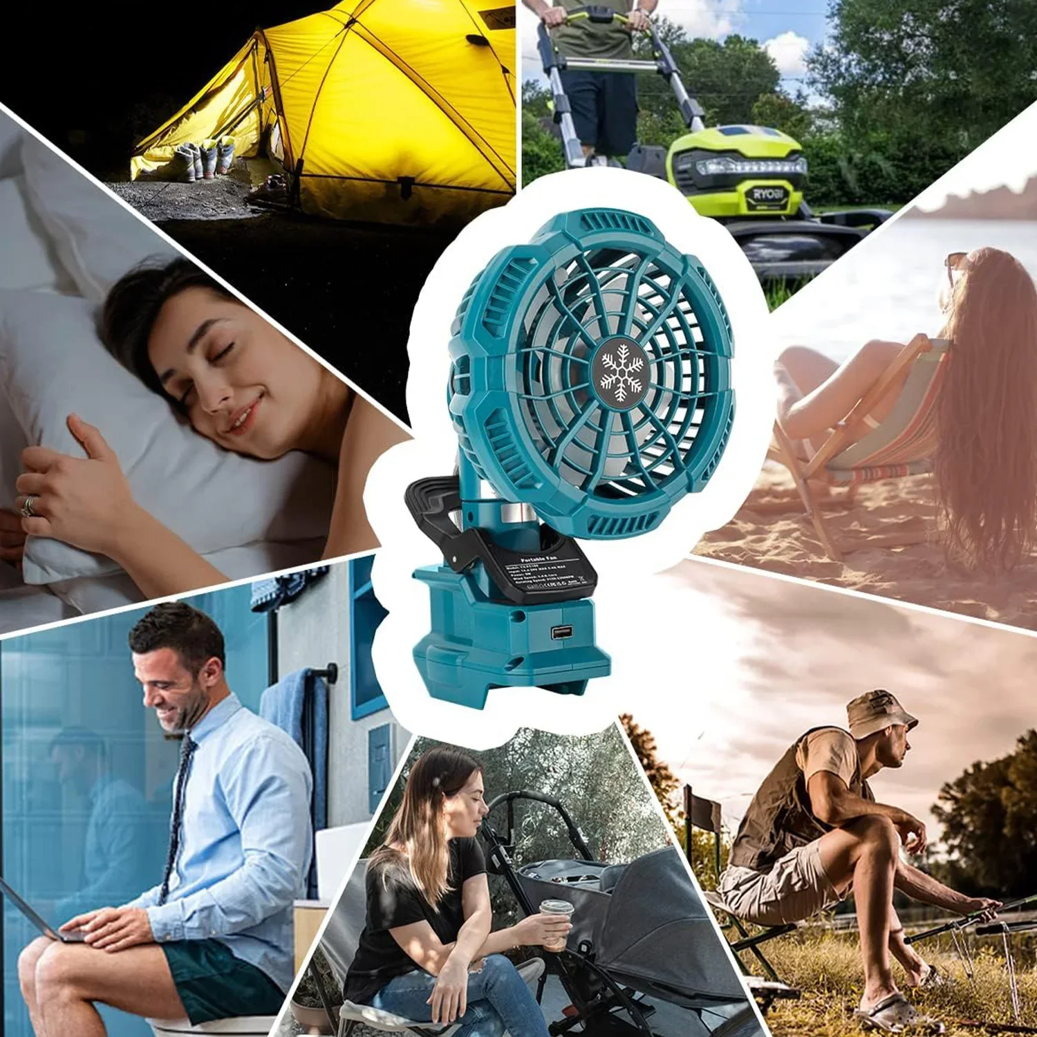 [18V Cordless Fan] - This 6.5-inch battery fan (blade diameter 4.25 inches) is perfectly compatible with Makita 14.4-20V lithium-ion batteries. If using a BL1850 5.0AH battery, this small fan can continuously deliver cool air for at least 15 hours. Equipped with a USB 5V/2.1A output power port, you can power your phone, camping lights, and other electronic devices. This is a must-have tool for you and your family to go out and have fun. (excluding batteries).