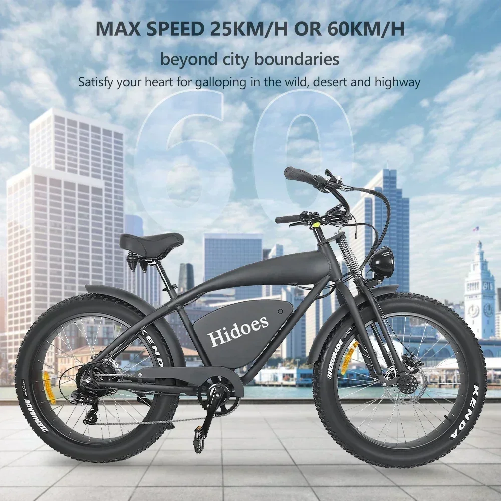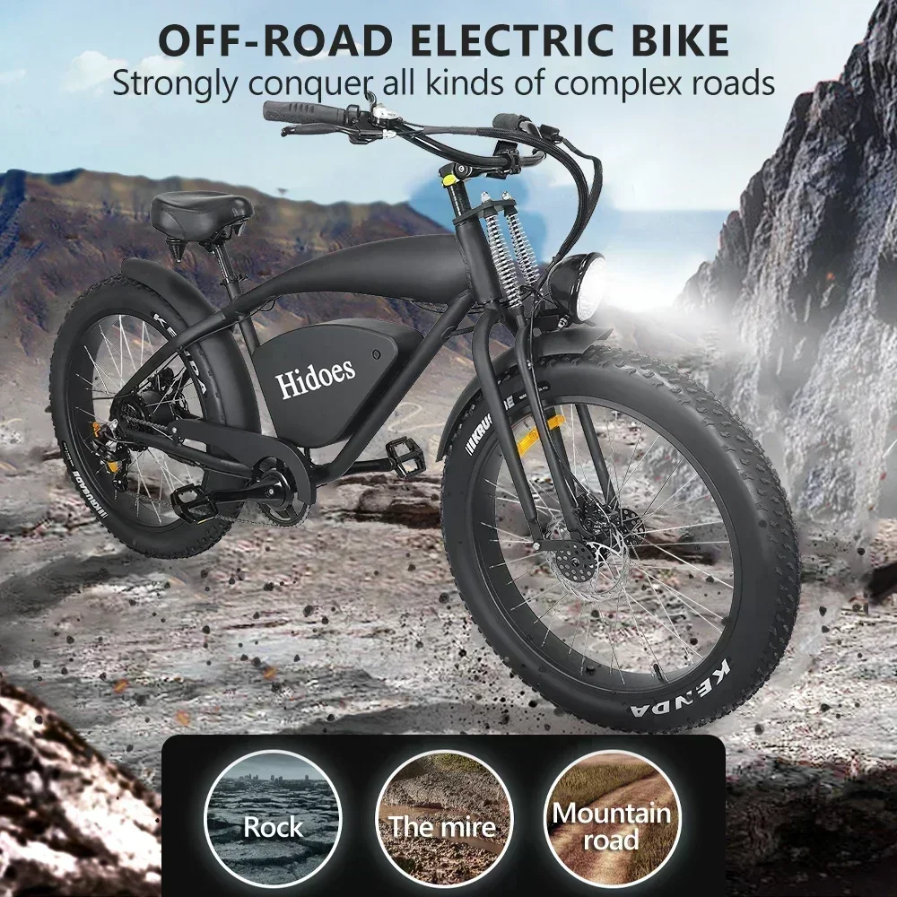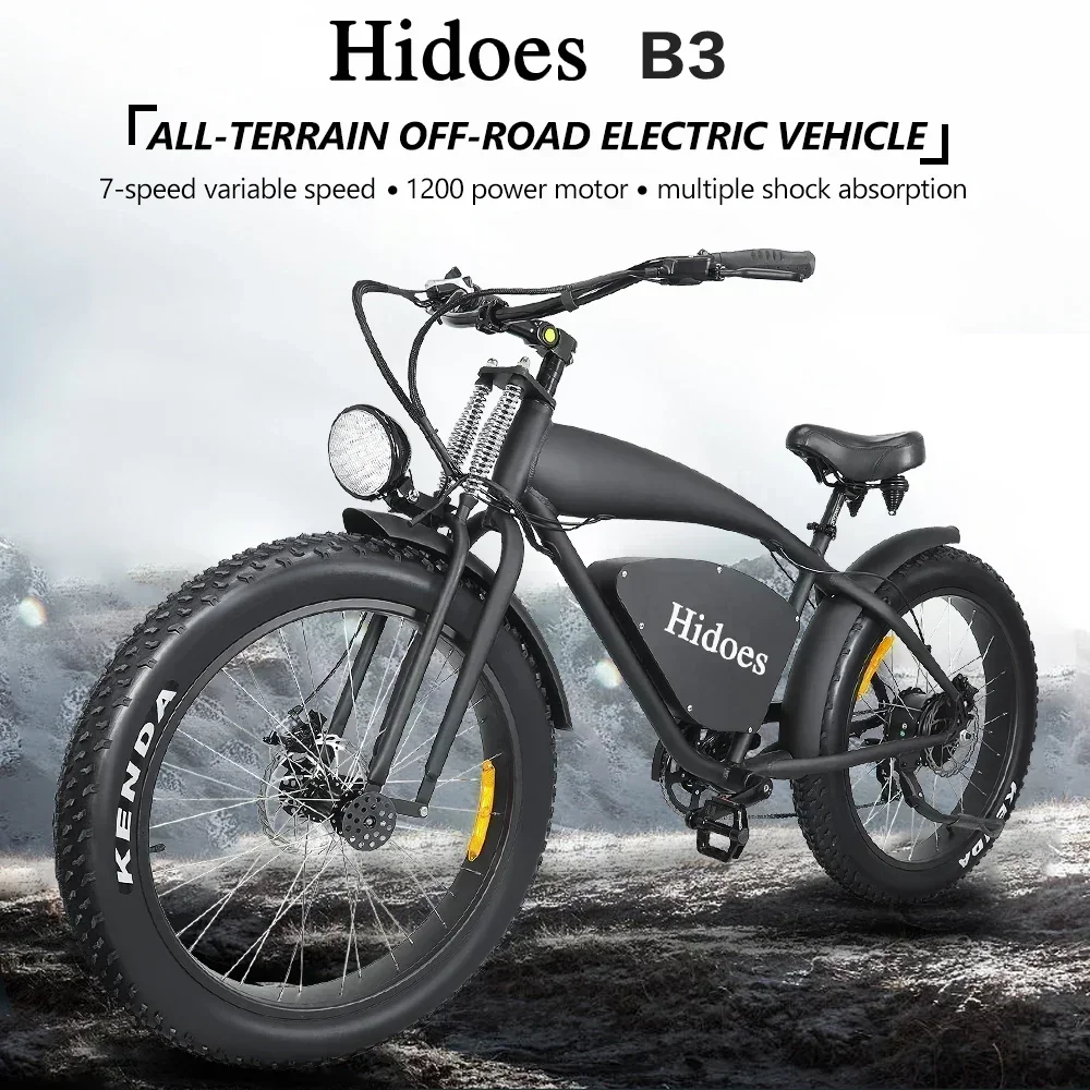 Step into a world of adventure with the Hidoes B3 Ebike. Featuring a powerful 1200W motor and a durable 48V 18.2AH battery, this retro electric bike is ready to take on any terrain. Its 26*4.0 inch fat tires provide exceptional stability on mountain trails and snow-covered paths. Whether you're cruising through the city or exploring off-road trails, this electric bicycle offers a smooth and exhilarating ride. Don't miss out on the thrill of riding the Hidoes B3 Ebike.