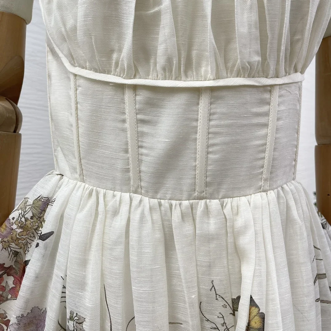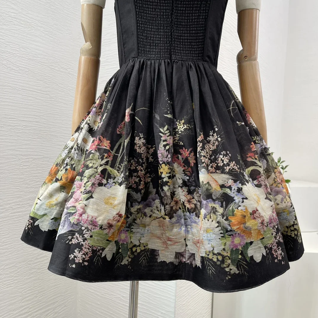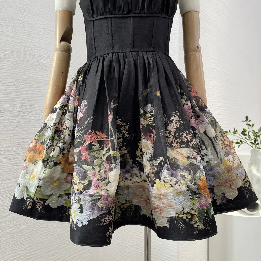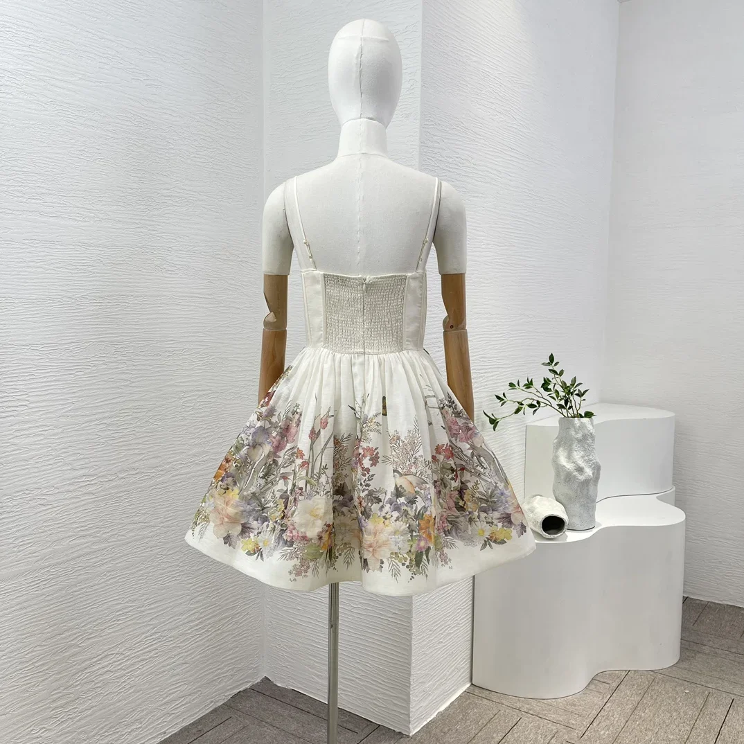 Re-tro Floral Printing White 2024 Women Silk Linen Sleeveless Pleats Waist Shirred Summer Tube Black Mini Dress for Holiday