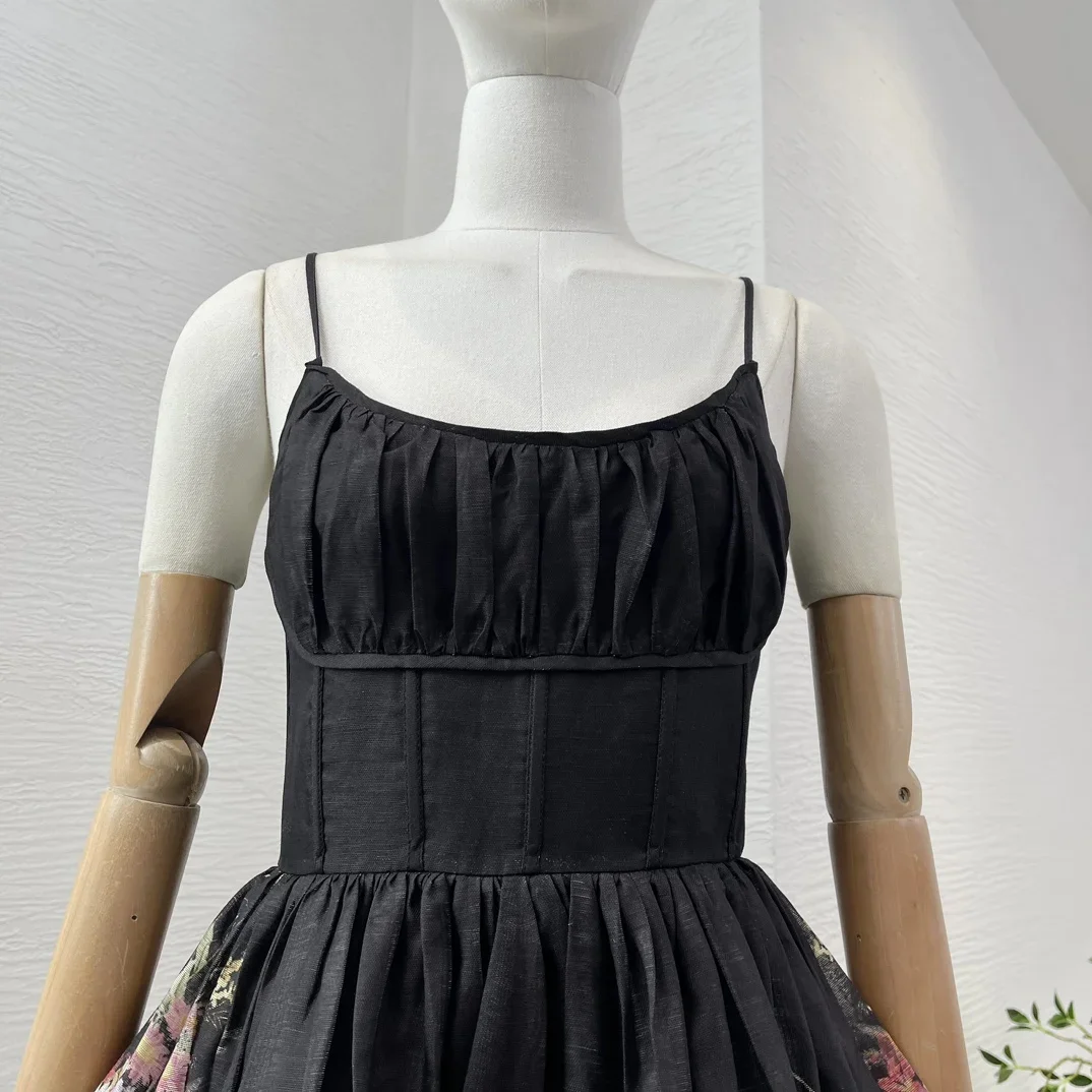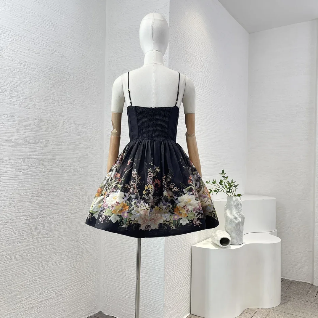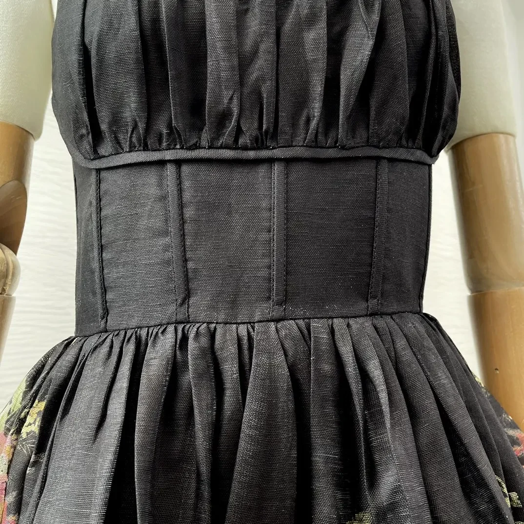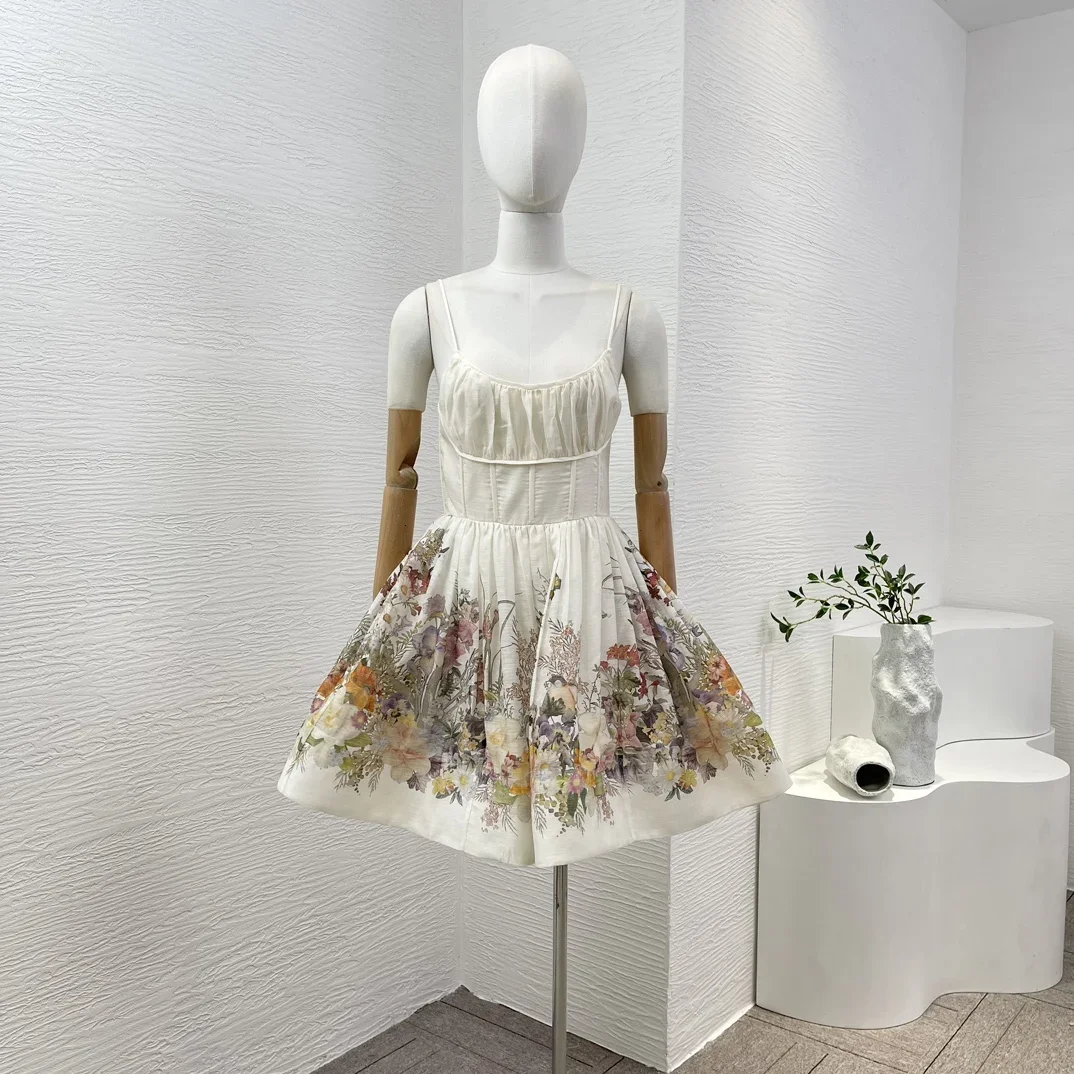 Re-tro Floral Printing White 2024 Women Silk Linen Sleeveless Pleats Waist Shirred Summer Tube Black Mini Dress for Holiday