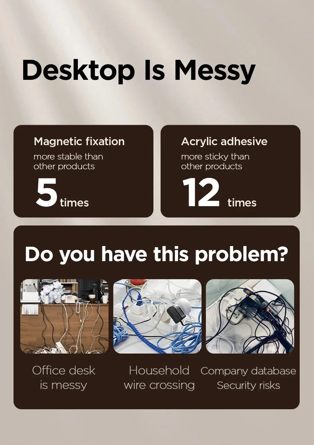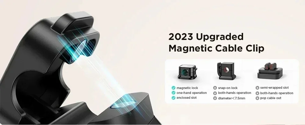 2.【Magnetic Clamp Design】The unique magnetic opening and closing cable clip design allows you to place and remove cables with only one hand. Unlike other cord holders on the market, Joyroom cable organizer uses a sophisticated 60° rotating shaft and magnetic locking cord design, helping you easily snatch a cord off or easily add a cord easily.