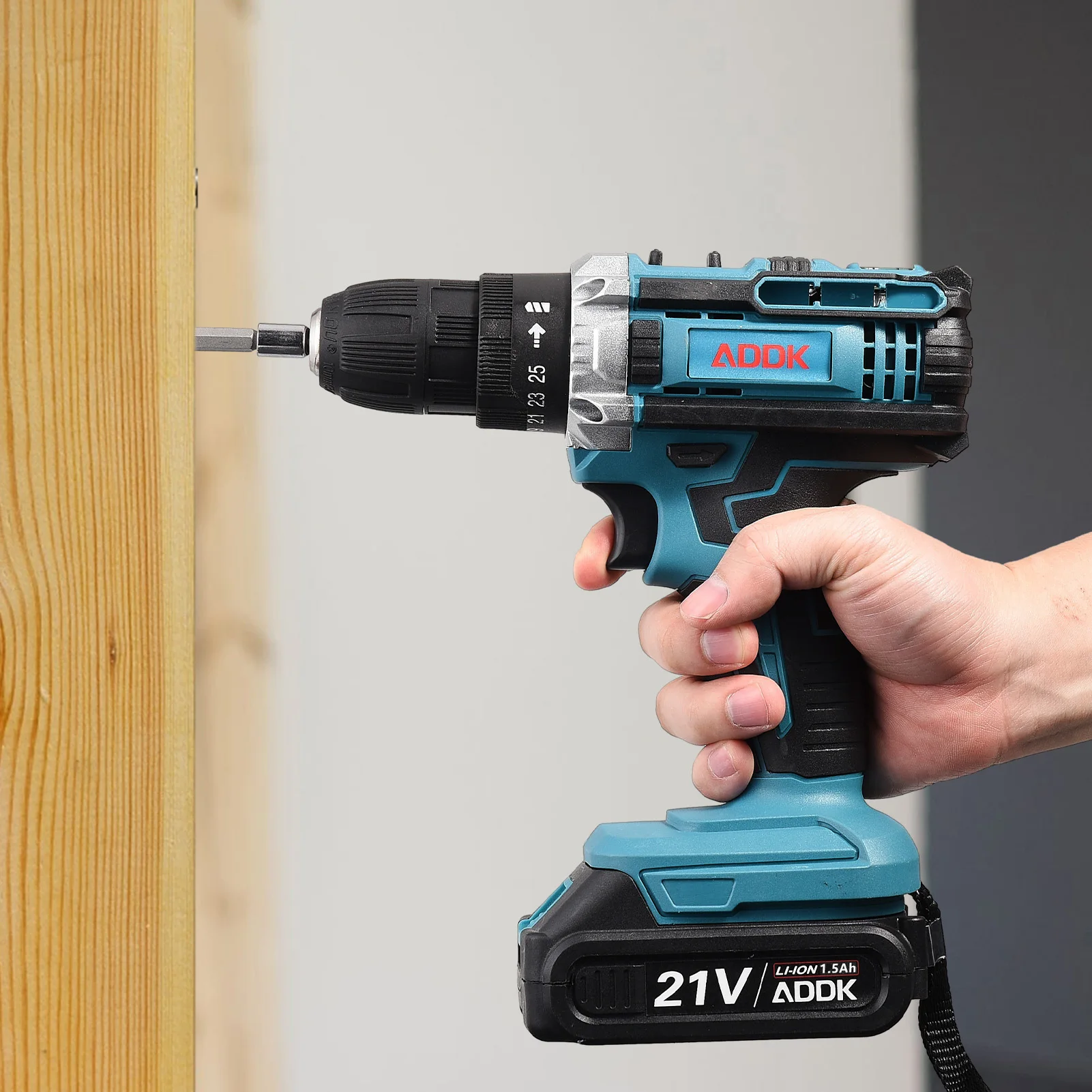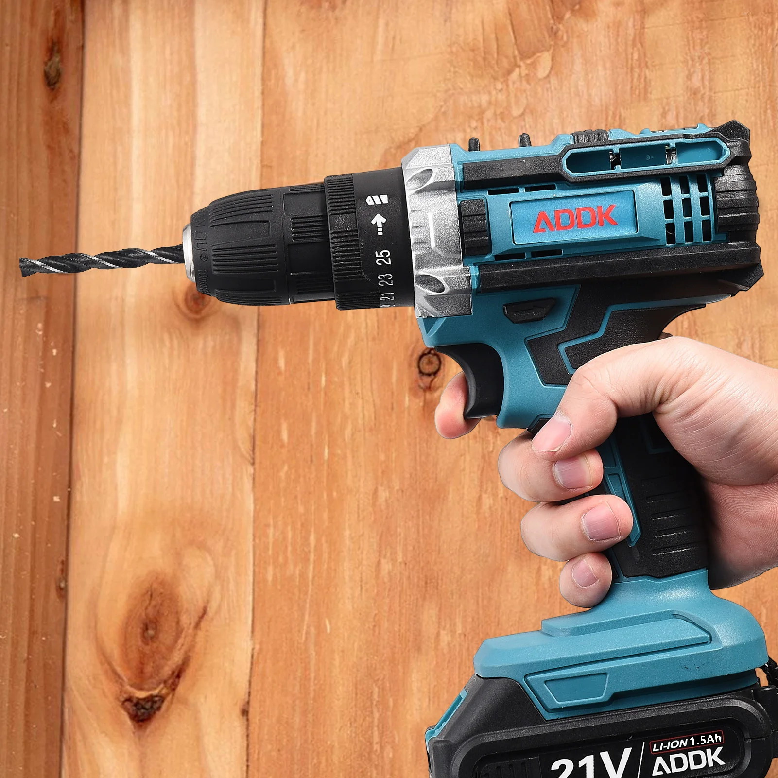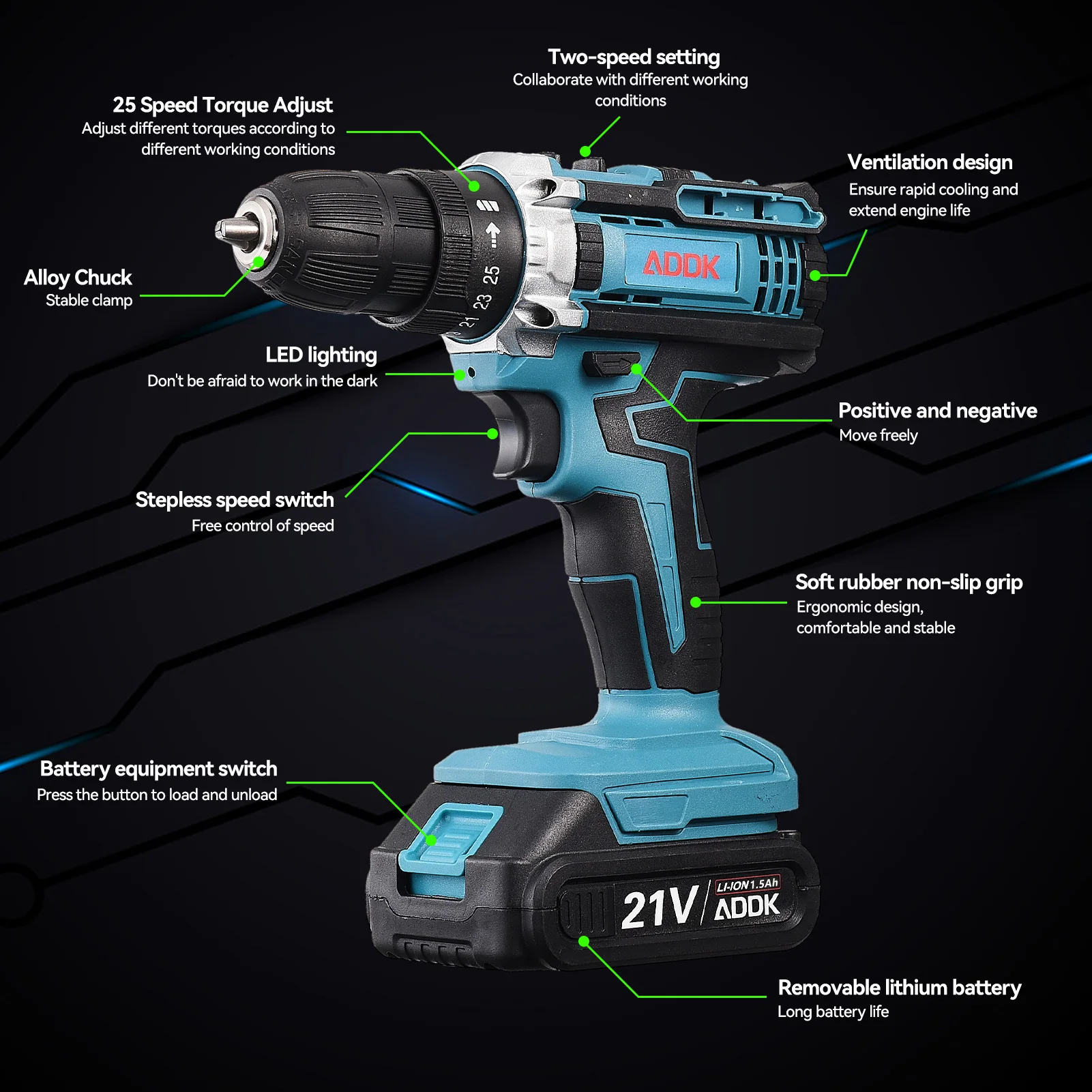 21V Cordless Drill Kit, Brush Motor with Euro Charger, with 2 Boxes of 1500 mAh Batteries, for Home DIY Projects