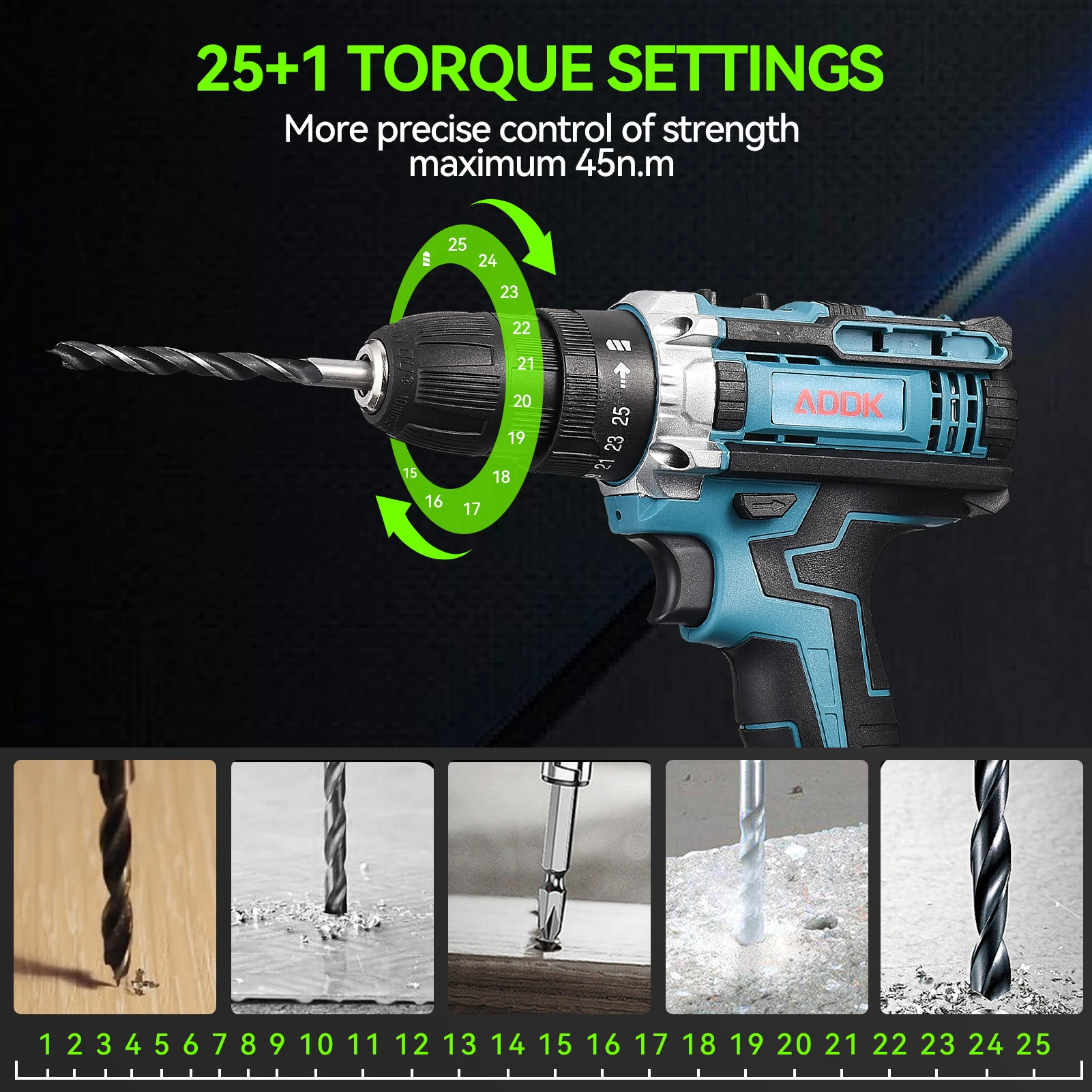 3.2 SPEED VARIATIONS AND 25+1 TORQUE SETTINGS: The rechargeable screwdriver can be set to two different speed ranges to make your work more precise. You can choose the right torque according to your drilling or screwing needs to ensure high-precision work.
