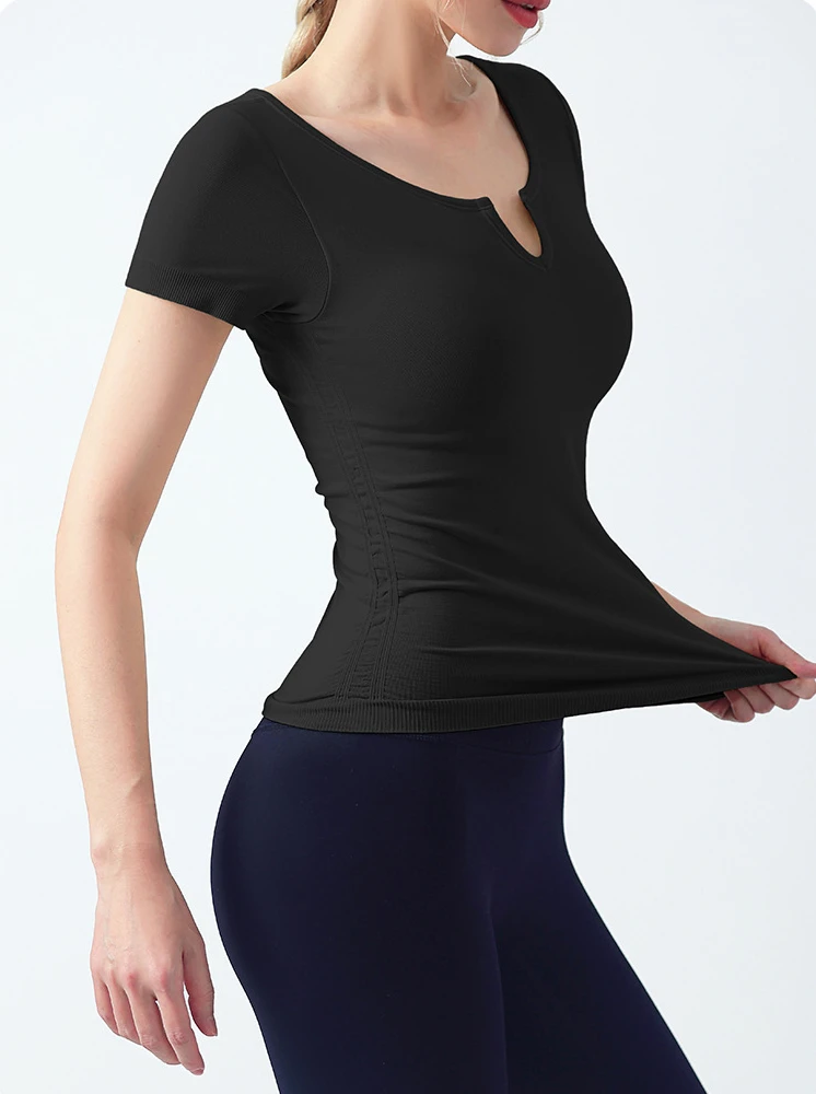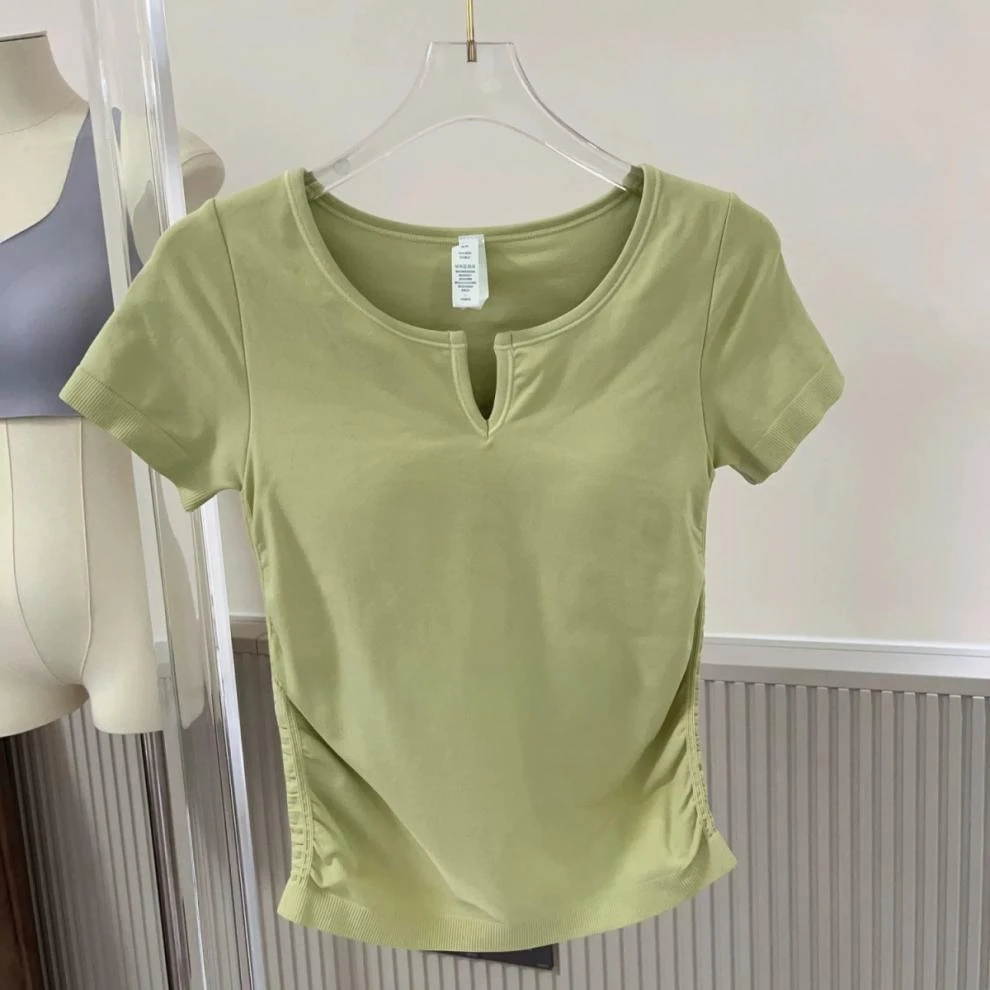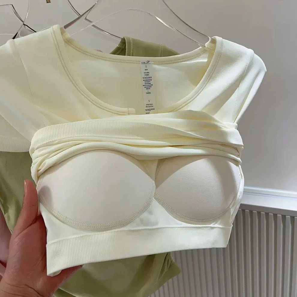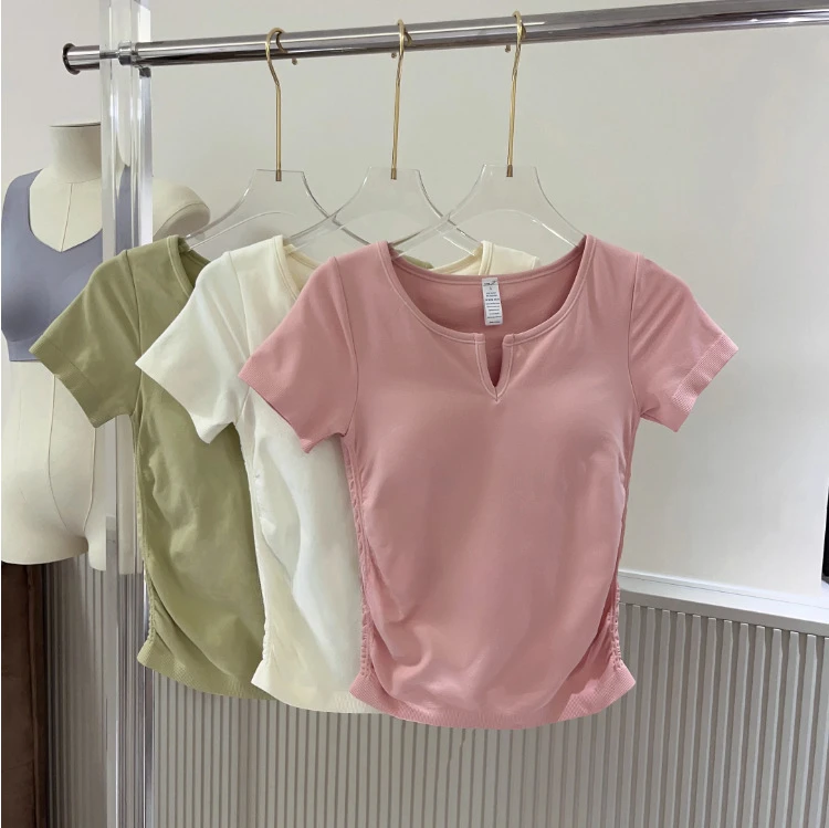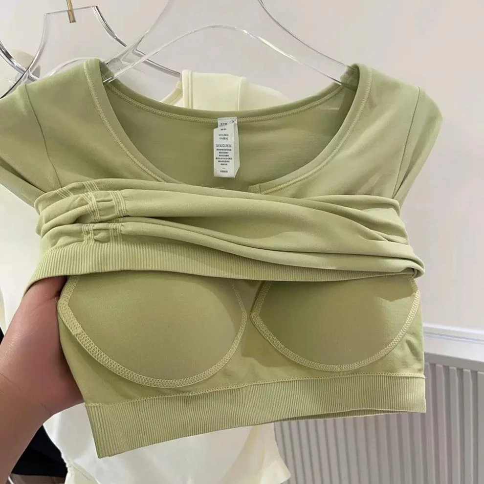 Seamless V-neck with Bra Pads Short-sleeved Women's Thin Slim Cups One-piece T-shirt Yoga Wear Fitness Tops for Women