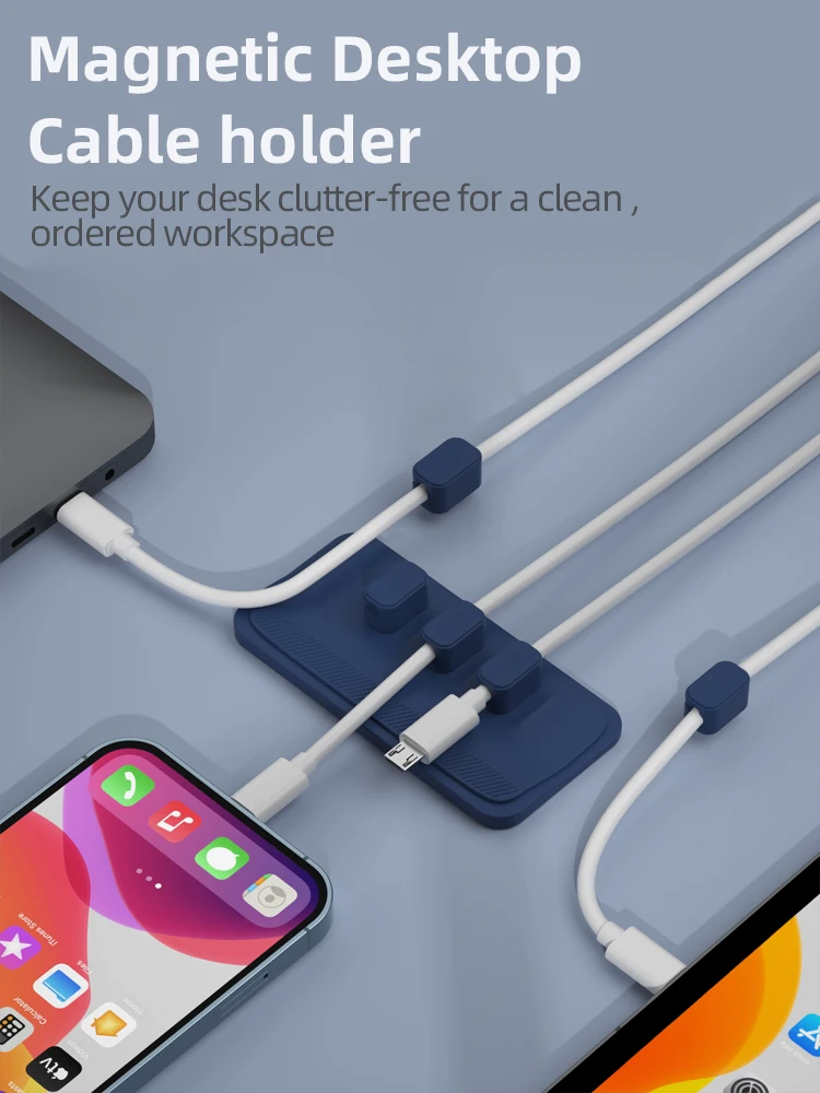 Cable Management, Magnetic Cable Holder, Desktop Multipurpose Cord Keeper, 5 Clips for Lightning Cables, USB C / Micro Cables