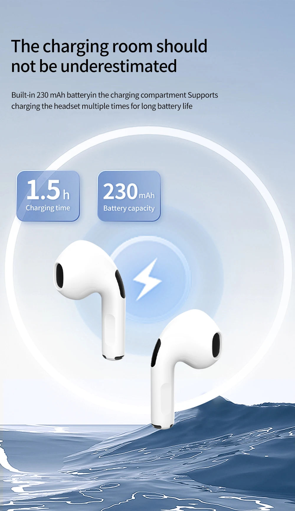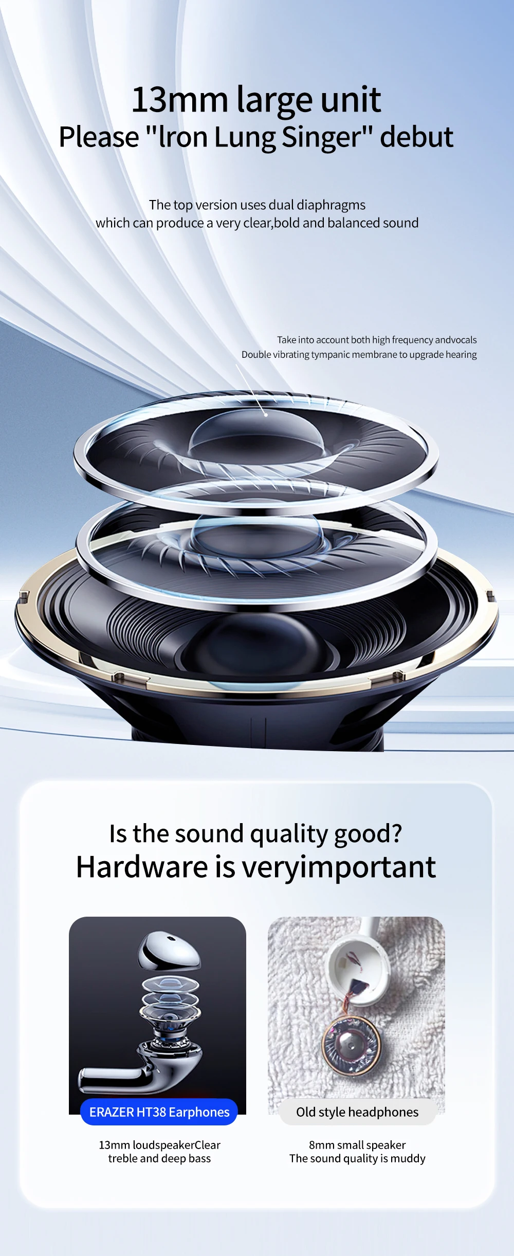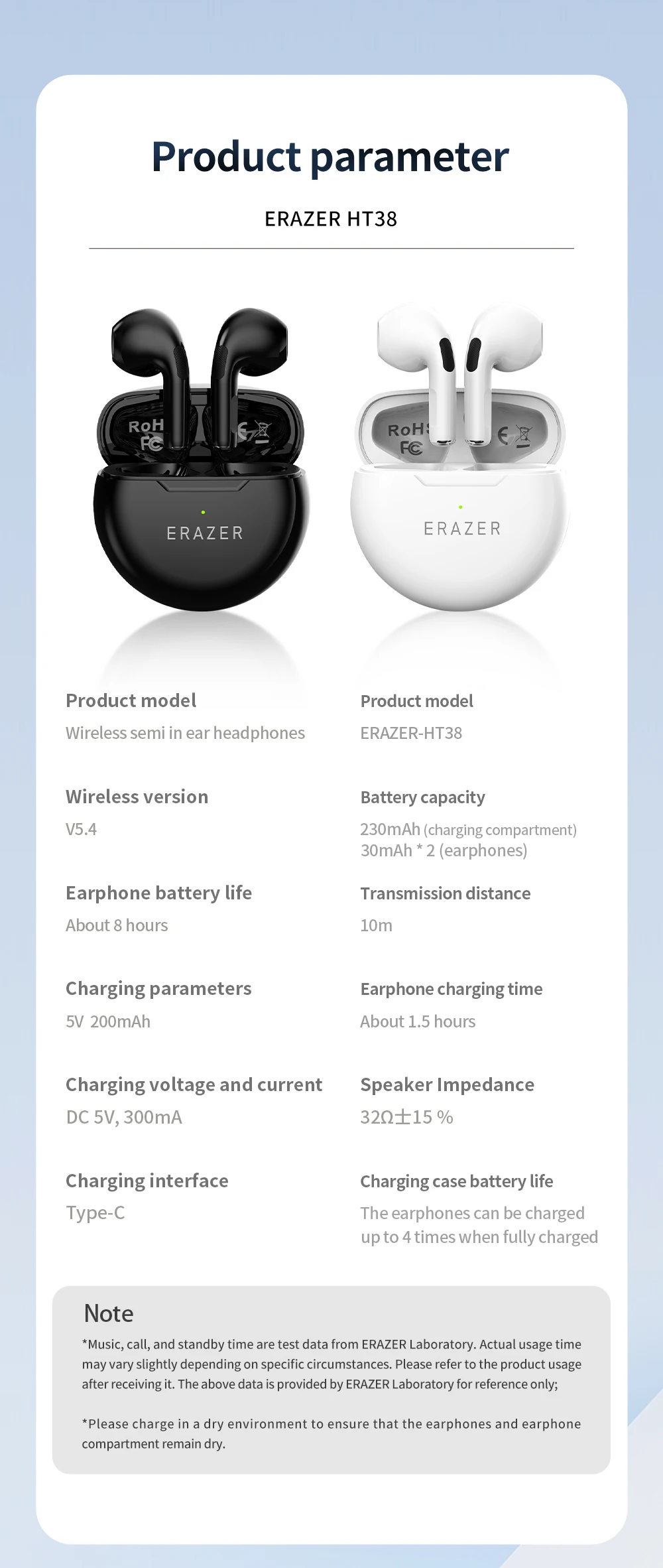 **Product parameter - ERAZER HT38****I. Wireless semi - in - ear headphones**1. **Wireless version**: V5.42. **Earphone battery life**: Approximately 8 hours3. **Charging parameters**: 5V 200mA4. **Charging voltage and current**: DC 5V, 300mA5. **Charging interface**: Type - C**II. ERAZER - HT38**1. **Battery capacity**- Charging compartment: 230mAh- Earphones (two): 30mAh × 22. **Transmission distance**: 10m3. **Earphone charging time**: Approximately 1.5 hours4. **Speaker Impedance**: 32Ω ± 15%5. **Charging case battery life**: The earphones can be charged up to 4 times when the charging case is fully charged.**III. Note**1. The data of music, call, and standby time are test results from the ERAZER Laboratory. The actual usage time may vary slightly depending on specific circumstances. Please refer to the product usage after receiving the product. The above data is for reference only.2. Please charge in a dry environment to ensure that the earphones and the charging compartment remain dry.