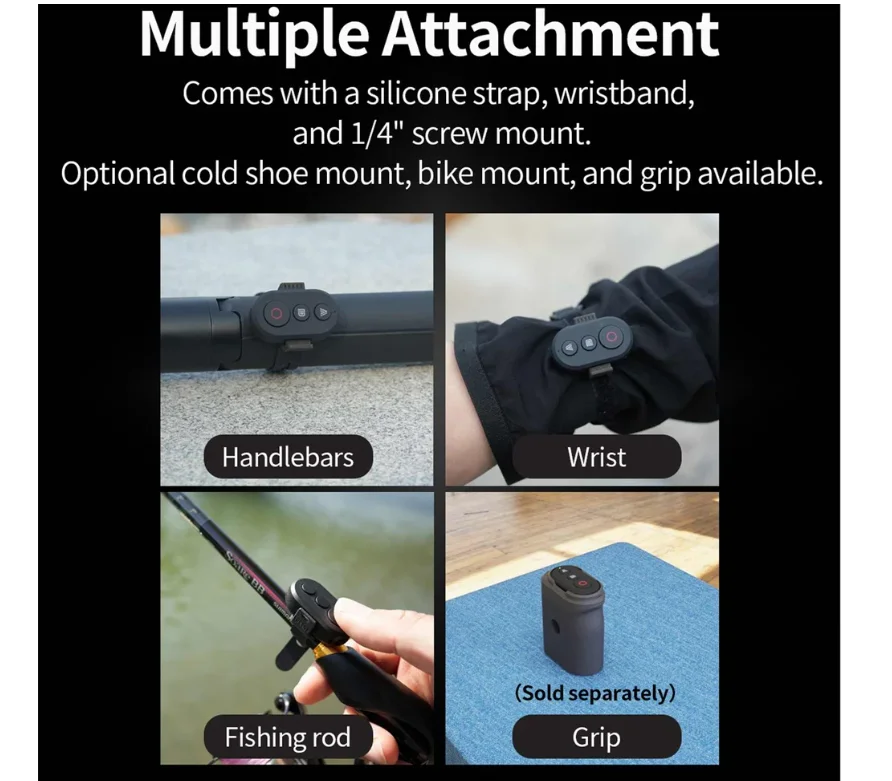 Multiple Attachments Included: Your purchase comes with a silicone strap, wristband, lanyard and 1/4" screw mount for added versatility. Optional accessories like cold shoe mounts, can be attached to handlebars, ishing rod and grips are also available to enhance your filming experience with this essential remote control.