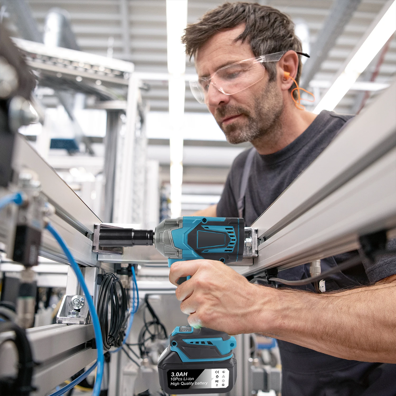 We've made sure that you're as safe as can be with our triple safety protection system:The cordless impact wrench has an ergonomically designed non-slip handle to prevent accidental dislodgement. And there's a safety interlock switch that can only be opened by simultaneous presses, so you can rest easy knowing it's safe. And last but not least, it has an internal system to protect against overcurrent, high temperatures and short circuits.