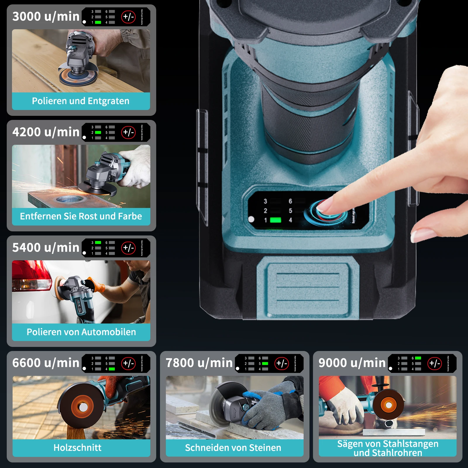 [Precise Speed Control]: This 125mm angle grinder offers stepless speed control and six-level speed adjustment (0-3000/0-4200/0-5400/0-6600/0-7800/0-9000 rpm). The simple trigger control allows you to precisely adjust the speed according to your specific needs. Suitable for grinding, rust removal, polishing and cutting wood, stone and steel, it is an efficient and practical real multi-purpose tool.
