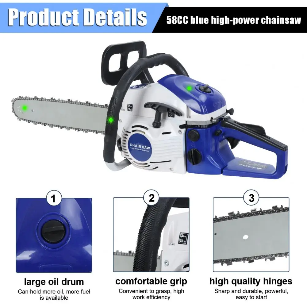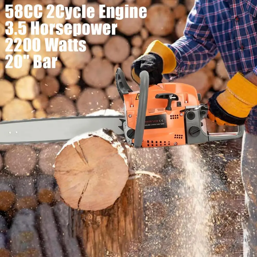 High Performance: 58cc 2-stroke powerful gas chainsaw delivers steady power to the 20-inch bar and low-kickback chain. Ideal tool for cutting firewood and felling trees with a much higher efficiency.