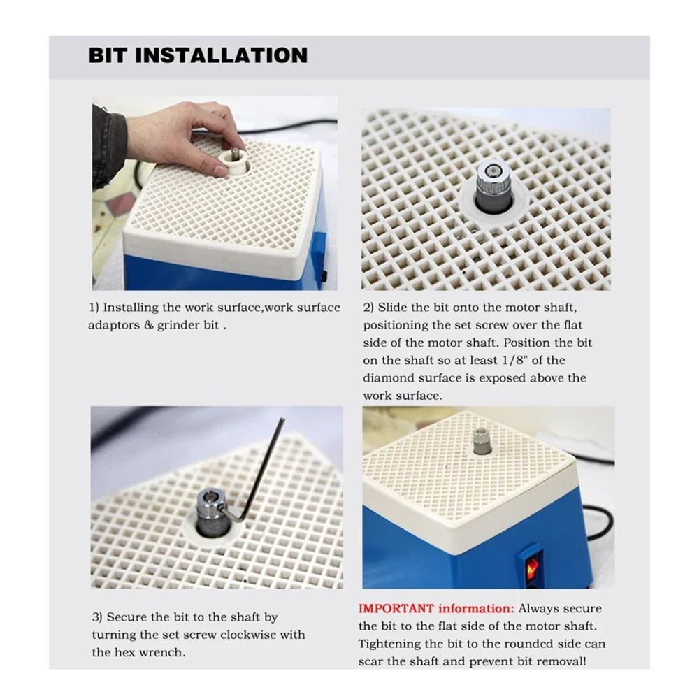 2. The grinding wheel mounted to the engine shaft, the fixed screw position higher than the engine shaft. The position of the grinding wheel on the axle must be at least 1/8 diamond part above the operating table.